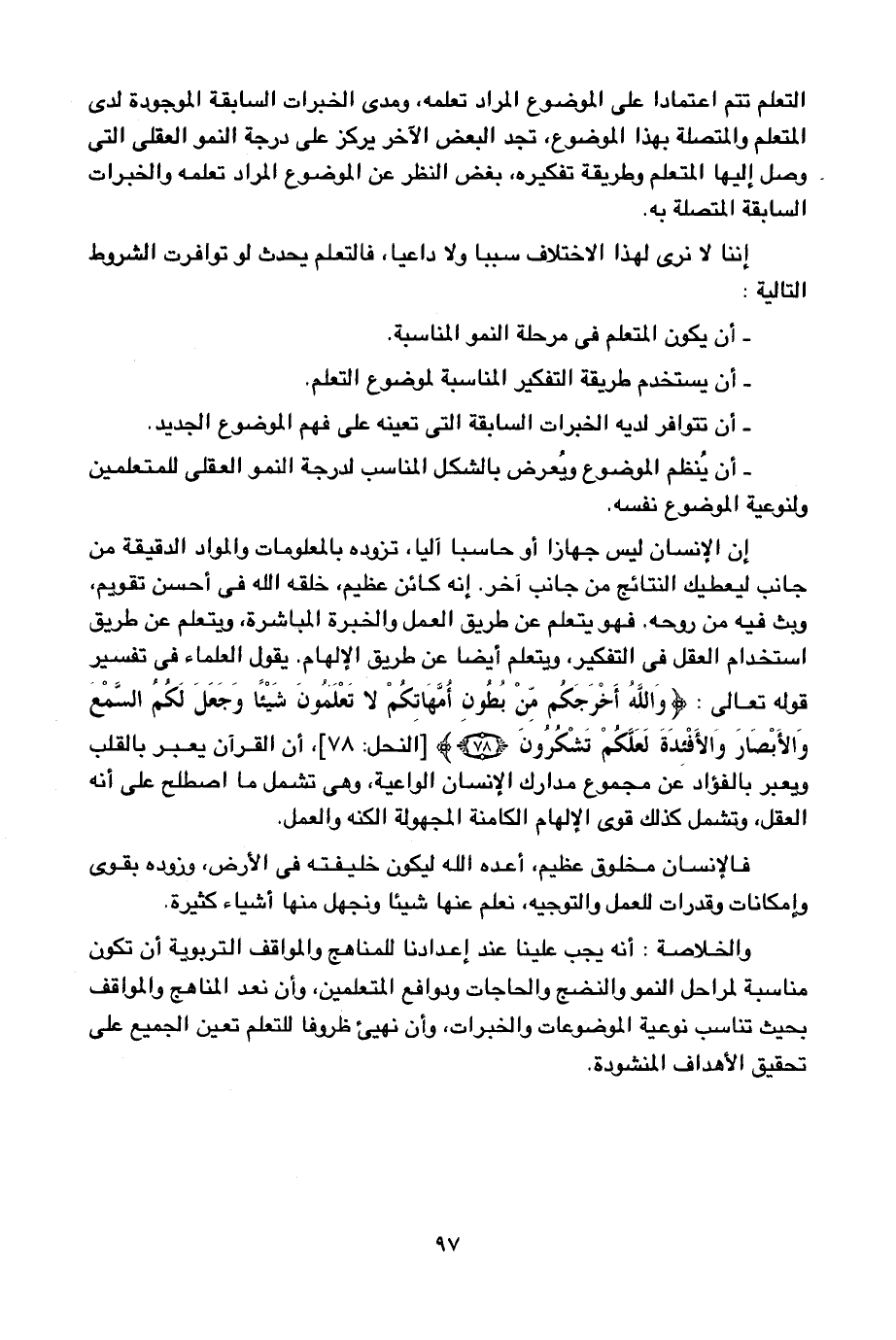والخلاصة: أنه يجب علينا عند إعدادنا للمناهج والمواقف التربوية أن تكون مناسبة لمراحل النمو والنضج والحاجات ودوافع المتعلمين، وأن نعد المناهج والمواقف بحيث تناسب نوعية الموضوعات والخبرات، وأن نهيئ ظروفا للتعلم تعين الجميع على تحقيق الأهداف المنشودة.