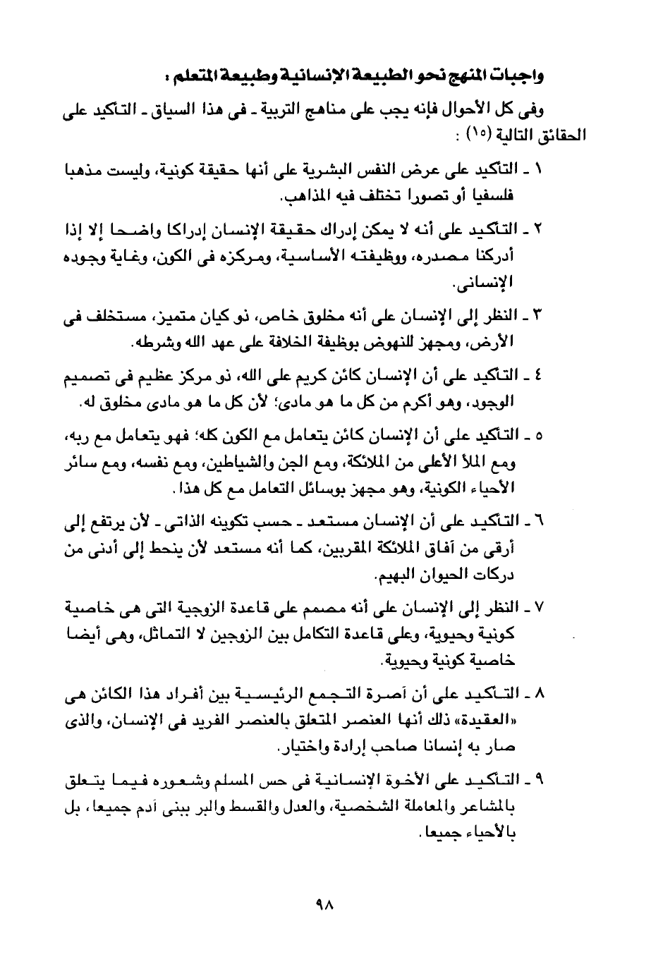 وفي كل الأحوال فإنه يجب على مناهج التربية -في هذا السياق- التأكيد على الحقائق التالية1: