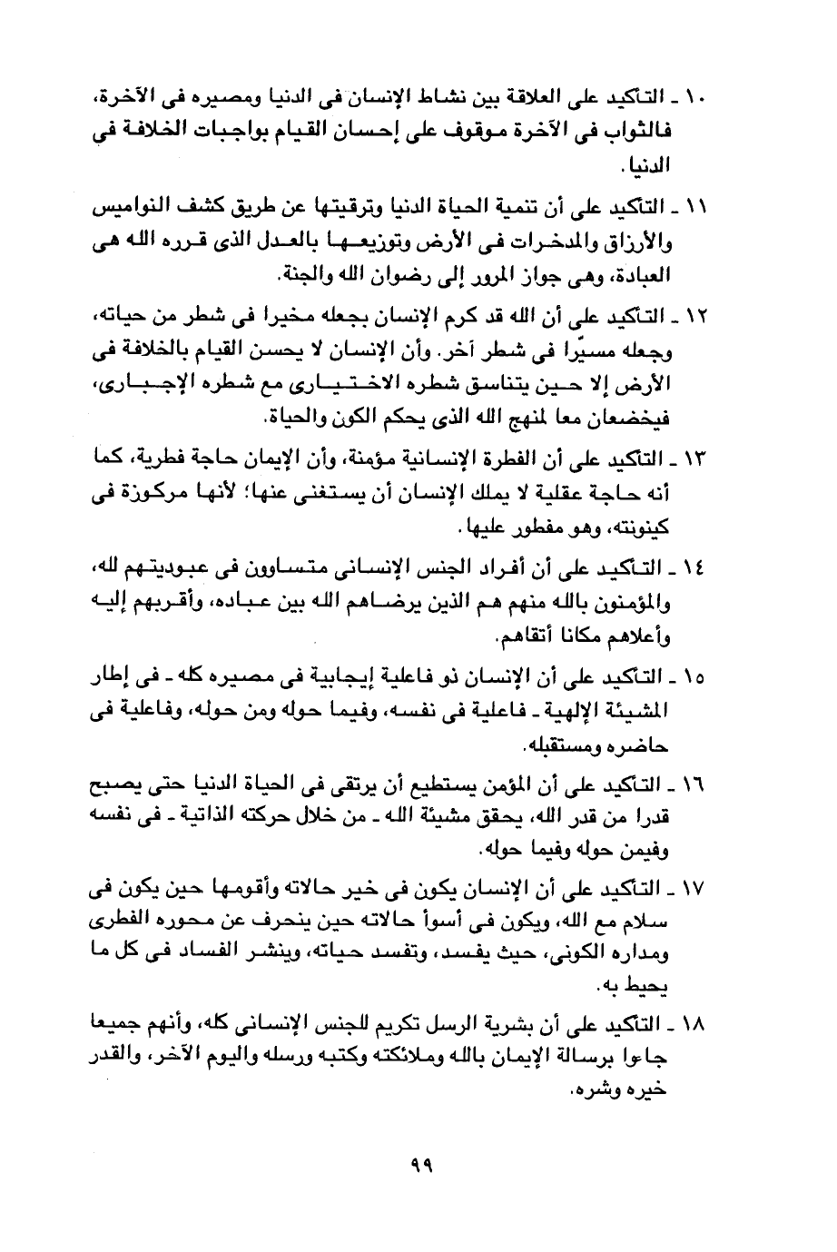 11- التأكيد على أن تنمية الحياة الدنيا وترقيتها عن طريق كشف النواميس والأرزاق والمدخرات في الأرض وتوزيعها بالعدل الذي قرره الله هي العبادة، وهي جواز المرور إلى رضوان الله والجنة.