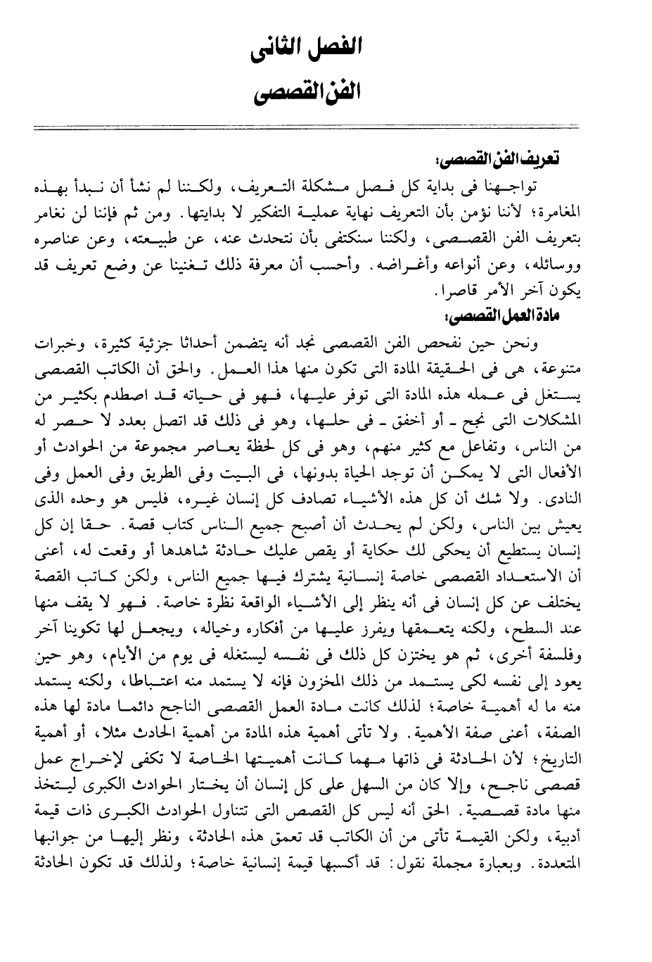 تواجهنا في بداية كل فصل مشكلة التعريف، ولكننا لم نشأ أن نبدأ بهذه المغامرة؛ لأننا نؤمن بأن التعريف نهاية عملية التفكير لا بدايتها. ومن ثم فإننا لن نغامر بتعريف الفن القصصي، ولكننا سنكتفي بأن نتحدث عنه، عن طبيعته، وعن عناصره ووسائله، وعن أنواعه وأغراضه. وأحسب أن معرفة ذلك تغنينا عن وضع تعريف قد يكون آخر الأمر قاصرًا.