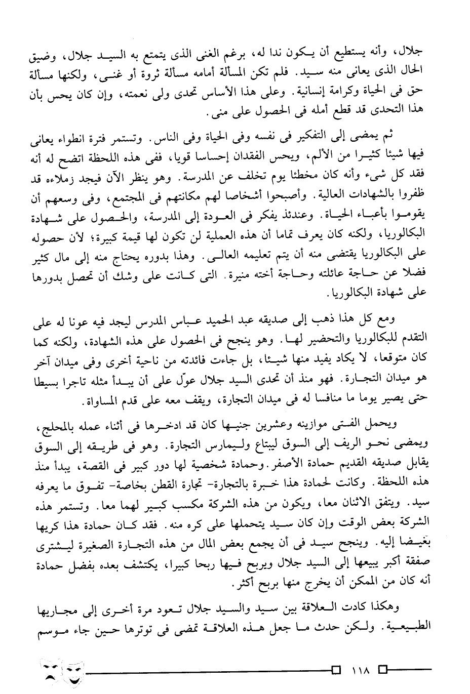جلال، وأنه يستطيع أن يكون ندًّا له، برغم الغنى الذي يتمتع به السيد جلال، وضيق الحال الذي يعاني منه سيد. فلم تكن المسألة أمامه مسألة ثروة أو غنى، ولكنها مسألة حق في الحياة وكرامة إنسانية. وعلى هذا الأساس تحدى ولي نعمته، وإن كان يحس بأن هذا التحدي قد قطع أمله في الحصول على منى.