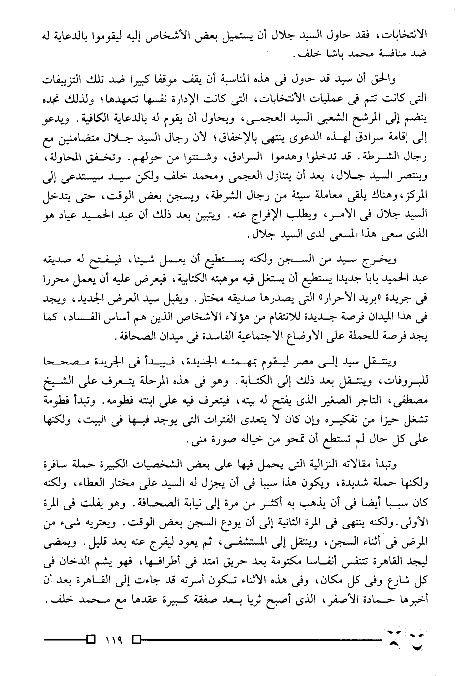 والحق أن السيد قد حاول في هذه المناسبة أن يقف موقفًا كبيرًا ضد تلك التزييفات التي كانت تتم في عمليات الانتخابات، التي كانت الإدارة نفسها تتعهدها؛ ولذلك نجده ينضم إلى المرشح الشعبي السيد العجمي، ويحاول أن يقوم له بالدعاية الكافية. ويدعو إلى إقامة سرادق لهذه الدعوى ينتهي بالإخفاق؛ لأن رجال السيد جلال متضامنين مع رجال الشرطة قد تدخلوا وهدموا السرادق، وشتتوا من حولهم. وتخفق المحاولة، وينتصر السيد جلال، بعد أن يتنازل العجمي ومحمد خلف ولكن السيد سيستدعى إلى المركز، وهناك يلقى معاملة سيئة من رجال الشرطة، ويسجن بعض الوقت، حتى يتدخل السيد جلال في الأمر، ويطلب الإفراج عنه. ويتبين بعد ذلك أن عبد الحميد عباس هو الذي سعى هذا المسعى لدى السيد جلال.