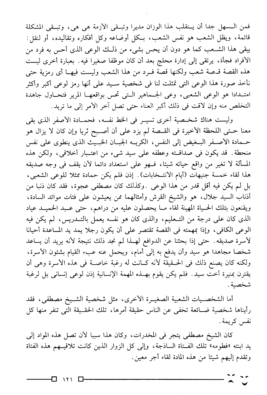 وليست هناك شخصية أخرى تسير في الخط نفسه، فحمادة الأصفر الذي بقي معنا حتى اللحظة الأخيرة في القصة لم يزد على أن أصبح ثريا, وإن كان لا يزال هو حمادة الأصفر البغيض إلى النفس، الكريه الجبان الخبيث الذي ينطوي على نفس منحطة. قد يكون في صداقته وعطفه على سيد شيء من اعتبار أخلاقي، ولكن هذه المسألة لا تغير من واقع حياته شيئًا، فهو على استعداد دائمًا لأن يقف في وجه صديقه هذا لقاء خمسة جنيهات "أيام الانتخابات". إذن فلم يكن حمادة ممثلا للوعي الشعبي، بل لم يكن فيه أقل قدر من هذا الوعي. وكذلك كان مصطفى عجوة، فقد كان ذنبًا من أذناب السيد جلال، هو والشيخ القرش وأمثالهما ممن يعيشون على فتات موائد السادة، ويقنعون بتلك الحياة المهينة لقاء ما يحصلون عليه من دراهم، حتى عبد الحميد عباس الذي كان على درجة من التعليم، والذي كان هو نفسه يعمل بالتدريس، لم يكن فيه الوعي الكافي، وإذا بمهمته في القصة تقتصر على أن يكون رجلا يمد يد المساعدة أحيانًا لأسرة صديقه, حتى إذا بحثنا عن الدوافع لهذا لم نجد ذلك؛ نتيجة لأنه يريد أن يساعد شخصًا مجاهدًا هو سيد وأن يدفع به إلى أمام، ويحمل عنه عبء القيام بشئون الأسرة، ولكنه كان يصنع ذلك في الحقيقة؛ لأنه كانت له رغبة خاصة في هذه الأسرة وهي أن يقترن بمنيرة أخت سيد, فلم يكن يقوم بهذه المهمة الإنسانية إذن لوعي إنساني, بل لرغبة شخصية.