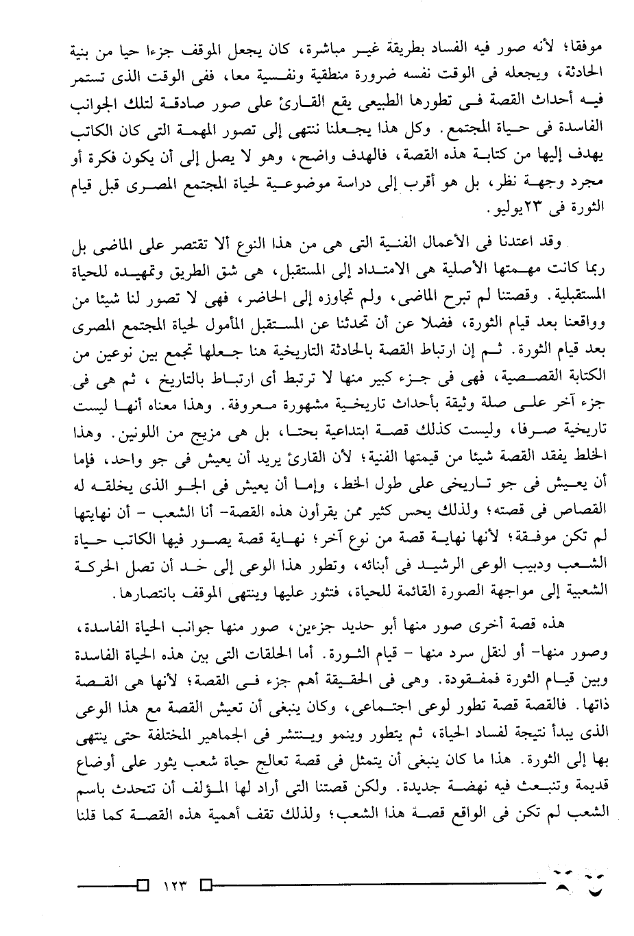 موفقًا؛ لأنه صور فيه الفساد بطريقة غير مباشرة، كان يجعل الموقف جزءًا حيًّا من بنية الحادثة، ويجعله في الوقت نفسه ضرورة منطقية ونفسية معًا، ففي الوقت الذي تستمر فيه أحداث القصة في تطورها الطبيعي يقع القارئ على صور صادقة لتلك الجوانب الفاسدة في حياة المجتمع. وكل هذا يجعلنا ننتهي إلى تصور المهمة التي كان الكاتب يهدف إليها من كتابة هذه القصة، فالهدف واضح، وهو لا يصل إلى أن يكون فكرة أو مجرد وجهة نظر، بل هو أقرب إلى دراسة موضوعية لحياة المجتمع المصري قبل قيام الثورة في 23 يوليو.