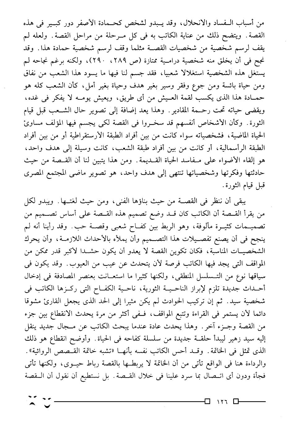 من أسباب الفساد والانحلال، وقد يبدو لشخص كحمادة الأصفر دور كبير في هذه القصة, ويتضح ذلك من عناية الكاتب به في كل مرحلة من مراحل القصة. ولعله لم يقف لرسم شخصية من شخصيات القصة مثلما وقف لرسم شخصية حمادة هذا. وقد نجح في أن يخلق منه شخصية درامية ممتازة "ص289، 290"، ولكنه برغم نجاحه لم يستغل هذه الشخصية استغلالًا شعبيًّا، فقد جسم لنا فيها ما يسود هذا الشعب من نفاق ومن حياة بائسة, ومن جوع وفقر وسير بغير هدف وحياة بغير أمل، كأن الشعب كله هو حمادة هذا الذي يكسب لقمة العيش من أي طريق، ويعيش يومه لا يفكر في غده، ويقضي حياته تحت رحمة المقادير. وهذا يعد إضافة إلى تصوير حال الشعب قبل قيام الثورة, وكأن الأشخاص أنفسهم قد سخروا في القصة لكي يجسم فيها المؤلف مساوئ الحياة الماضية، فشخصياته سواء كانت من بين أفراد الطبقة الأرستقراطية أو من بين أفراد الطبقة الرأسمالية، أو كانت من بين أفراد طبقة الشعب، كانت وسيلة إلى هدف واحد، هو إلقاء الأضواء على مفاسد الحياة القديمة. ومن هذا يتبين لنا أن القصة من حيث حادثتها وفكرتها وشخصياتها تنتهي إلى هدف واحد، هو تصوير ماضي المجتمع المصري قبل قيام الثورة.