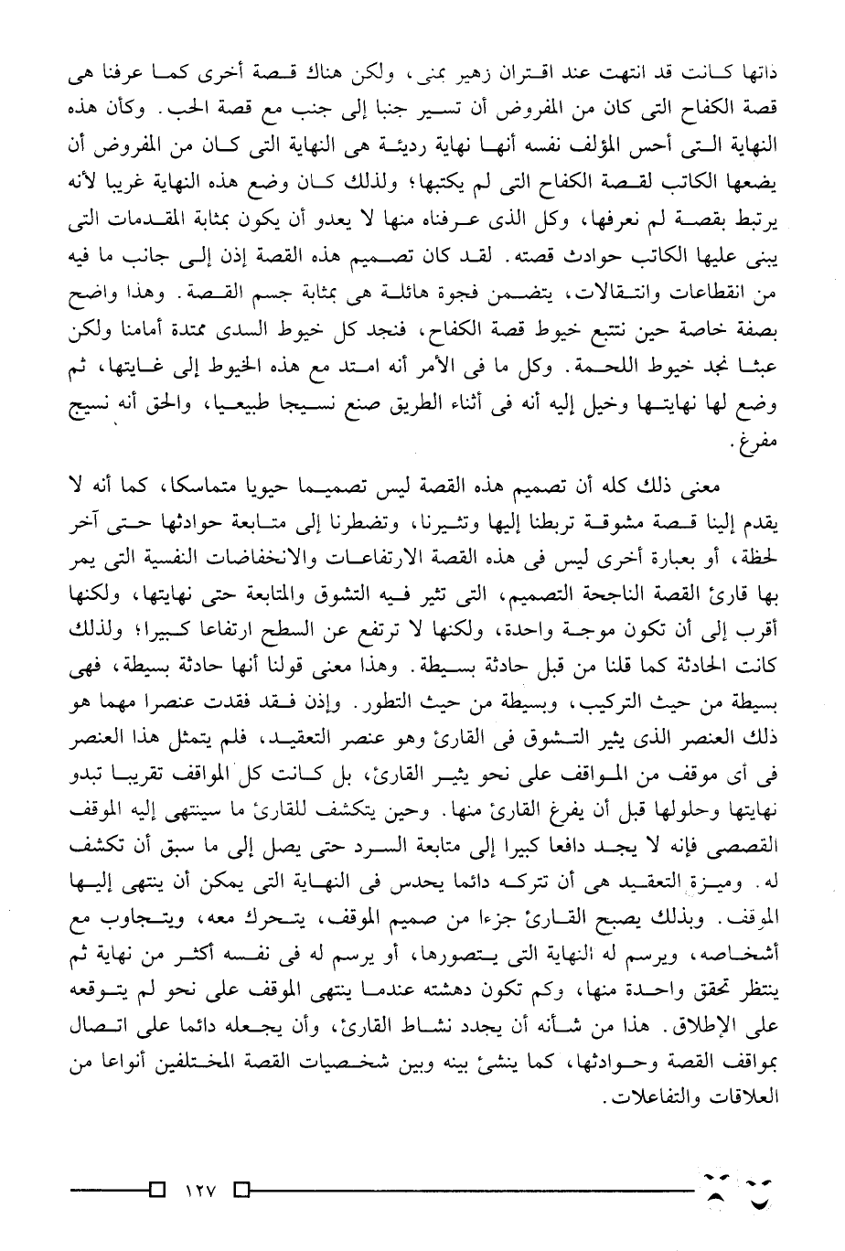 معنى ذلك كله أن تصميم هذه القصة ليس تصميمًا حيويًّا متماسكًا، كما أنه لا يقدم إلينا قصة مشوقة تربطنا إليها وتثيرنا، وتضطرنا إلى متابعة حوادثها حتى آخر لحظة، أو بعبارة أخرى ليس في هذه القصة الارتفاعات والانخفاضات النفسية التي يمر بها قارئ القصة الناجحة التصميم، التي تثير فيه التشوق والمتابعة حتى نهايتها، ولكنها أقرب إلى أن تكون موجة واحدة، ولكنها لا ترتفع عن السطح ارتفاعًا كبيرًا؛ ولذلك كانت الحادثة كما قلنا من قبل حادثة بسيطة. وهذا معنى قولنا: إنها حادثة بسيطة، فهي بسيطة من حيث التركيب، وبسيطة من حيث التطور. وإذن فقد فقدت عنصرًا مهمًّا هو ذلك العنصر الذي يثير التشوق في القارئ وهو عنصر التعقيد، فلم يتمثل هذا العنصر في أي موقف من المواقف على نحو يثير القارئ، بل كانت كل المواقف تقريبًا تبدو نهايتها وحلولها قبل أن يفرغ القارئ منها. وحين يتكشف للقارئ ما سينتهي إليه الموقف القصصي فإنه لا يجد دافعًا كبيرًا إلى متابعة السرد حتى يصل إلى ما سبق أن تكشف له. وميزة التعقيد هي أن تتركه دائمًا يحدس في النهاية التي يمكن أن ينتهي إليها الموقف, وبذلك يصبح القارئ جزءًا من صميم الموقف، يتحرك معه، ويتجاوب مع أشخاصه، ويرسم له النهاية التي يتصورها، أو يرسم له في نفسه أكثر من نهاية ثم ينتظر تحقق واحدة منها، وكم تكون دهشته عندما ينتهي الموقف على نحو لم يتوقعه على الإطلاق. هذا من شأنه أن يجدد نشاط القارئ، وأن يجعله دائمًا على اتصال بمواقف القصة وحوادثها، كما ينشئ بينه وبين شخصيات القصة المختلفين أنواعًا من العلاقات والتفاعلات.