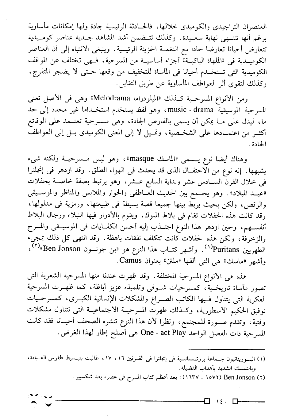 وهناك أيضًا نوع يسمى "الماسك masque"، وهو ليس مسرحية ولكنه شيء يشبهها. إنه نوع من الاحتفال الذي قد يحدث في الهواء الطلق. وقد ازدهر في إنجلترا في خلال القرن السادس عشر وبداية السابع عشر، وهو يرتبط بصفة خاصة بحفلات "عيد الميلاد". وهو يجمع بين الحديث العاطفي والحوار والملابس والمناظر والموسيقى والرقص، ولكن بحيث يربط بينها جميعًا قصة بسيطة في طبيعتها، ورمزية في مدلولها، وقد كانت هذه الحفلات تقام في بلاط الملوك، ويقوم بالأدوار فيها النبلاء ورجال البلاط أنفسهم، وحين ازدهر هذا النوع اجتذب إليه أحسن الكفايات في الموسيقى والمسرح والزخرفة، ولكن هذه الحفلات كانت تتكلف نفقات باهظة. وقد انتهى كل ذلك بمجيء الطهريين1 Puritans. وأشهر كتاب هذا النوع هو "بن جونسون2 Ben Jonson"، وأشهر"ماسك" هي التي ألفها "ملتن" بعنوان Camus.