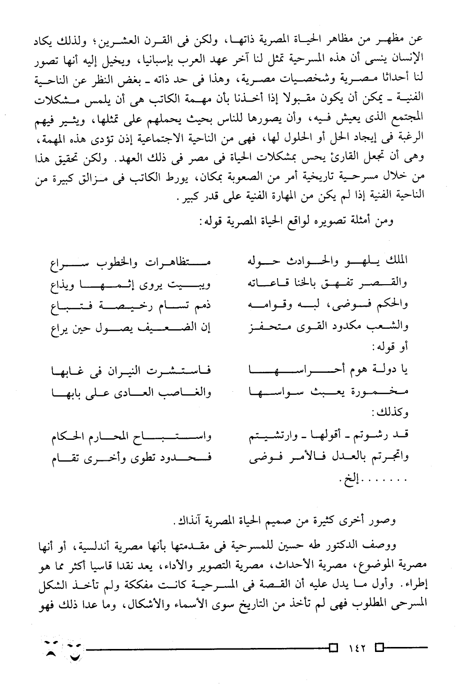 عن مظهر من مظاهر الحياة المصرية ذاتها، ولكن في القرن العشرين؛ ولذلك يكاد الإنسان ينسى أن هذه المسرحية تمثل لنا آخر عهد العرب بإسبانيا، ويخيل إليه أنها تصور لنا أحداثًا مصرية وشخصيات مصرية، وهذا في حد ذاته -بغض النظر عن الناحية الفنية- يمكن أن يكون مقبولا إذا أخذنا بأن مهمة الكاتب هي أن يلمس مشكلات المجتمع الذي يعيش فيه، وأن يصورها للناس بحيث يحملهم على تمثلها، ويثير فيهم الرغبة في إيجاد الحل أو الحلول لها، فهي من الناحية الاجتماعية إذن تؤدي هذه المهمة، وهي أن تجعل القارئ يحس بمشكلات الحياة في مصر في ذلك العهد. ولكن تحقيق هذا من خلال مسرحية تاريخية أمر من الصعوبة بمكان، يورط الكاتب في مزالق كبيرة من الناحية الفنية إذا لم يكن من المهارة الفنية على قدر كبير.