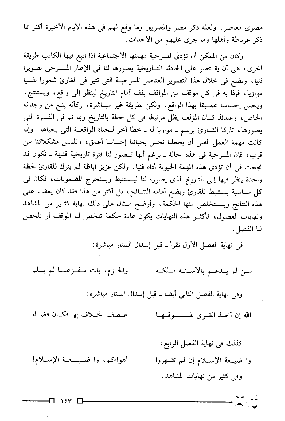 وكان من الممكن أن تؤدي المسرحية مهمتها الاجتماعية إذا اتبع فيها الكاتب طريقة أخرى، هي أن يقتصر على الحادثة التاريخية يصورها لنا في الإطار المسرحي تصويرًا فنيًّا، ويضع في خلال هذا التصوير العناصر المسرحية التي تثير في القارئ شعورًا نفسيًّا موازيًا، فإذا به في كل موقف من المواقف يقف أمام التاريخ لينظر إلى واقع، ويستنتج، ويحس إحساسًا عميقًا بهذا الواقع، ولكن بطريقة غير مباشرة، وكأنه ينبع من وجدانه الخاص، وعندئذ كان المؤلف يظل مرتبطًا في كل لحظة بالتاريخ وبما تم في الفترة التي يصورها، تاركًا القارئ يرسم -موازيًا له- خطا آخر للحياة الواقعة التي يحياها. وإذا كانت مهمة العمل الفني أن يجعلنا نحس بحياتنا إحساسًا أعمق، ونلمس مشكلاتنا عن قرب، فإن المسرحية في هذه الحالة -برغم أنها تصور لنا فترة تاريخية قديمة- تكون قد نجحت في أن تؤدي هذه المهمة الحيوية أداء فنيا. ولكن عزيز أباظة لم يترك للقارئ لحظة واحدة ينظر فيها إلى التاريخ الذي يصوره لنا ليستنبط ويستخرج المضمونات، فكان في كل مناسبة يستنبط للقارئ ويضع أمامه النتائج؛ بل أكثر من هذا فقد كان يعقب على هذه النتائج ويستخلص منها الحكمة، وأوضح مثال على ذلك نهاية كثير من المشاهد ونهايات الفصول، فأكثر هذه النهايات يكون عادة حكمة تلخص لنا الموقف أو تلخص لنا الفصل.