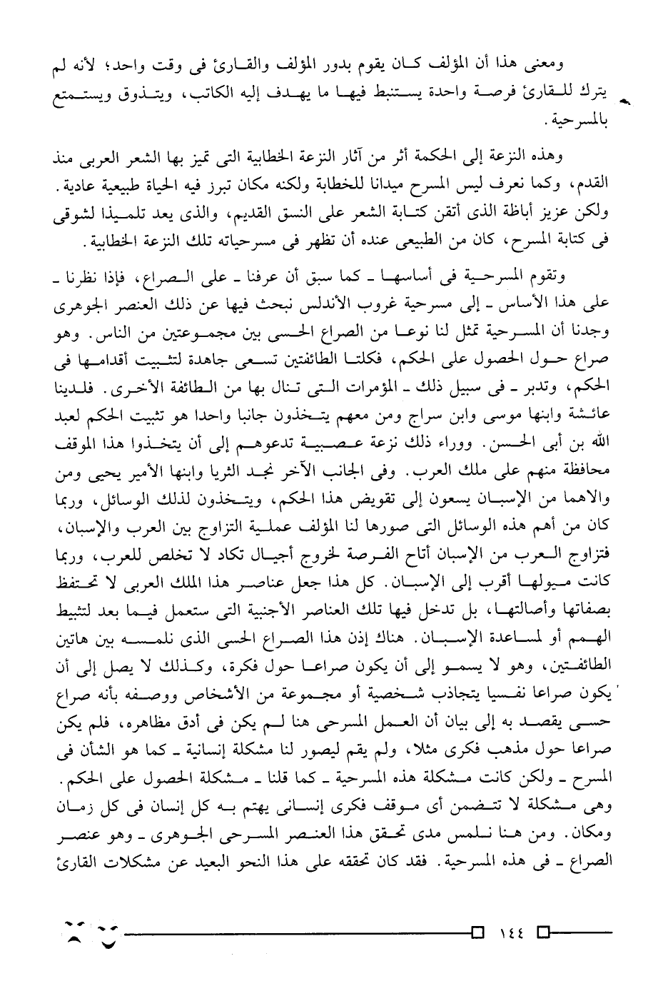 وتقوم المسرحية في أساسها -كما سبق أن عرفنا- على الصراع، فإذا نظرنا -على هذا الأساس- إلى مسرحية "غروب الأندلس" نبحث فيها عن ذلك العنصر الجوهري وجدنا أن المسرحية تمثل لنا نوعًا من الصراع الحسي بين مجموعتين من الناس. وهو صراع حول الحصول على الحكم، فكلتا الطائفتين تسعى جاهدة لتثبيت أقدامها في الحكم، وتدبر -في سبيل ذلك- المؤامرات التي تنال بها من الطائفة الأخرى. فلدينا عائشة وابنها موسى وابن سراج ومن معهم يتخذون جانبًا واحدًا هو تثبيت الحكم لعبد الله بن أبي الحسن, ووراء ذلك نزعة عصبية تدعوهم إلى أن يتخذوا هذا الموقف محافظة منهم على ملك العرب. وفي الجانب الآخر نجد الثريا وابنها الأمير يحيى ومن والاهما من الإسبان يسعون إلى تقويض هذا الحكم، ويتخذون لذلك الوسائل، وربما كان من أهم هذه الوسائل التي صورها لنا المؤلف عملية التزاوج بين العرب والإسبان، فتزاوج العرب من الإسبان أتاح الفرصة لخروج أجيال تكاد لا تخلص للعرب، وربما كانت ميولها أقرب إلى الإسبان. كل هذا جعل عناصر هذا الملك العربي لا تحتفظ بصفاتها وأصالتها، بل تدخل فيها تلك العناصر الأجنبية التي ستعمل فيما بعد لتثبيط الهمم أو لمساعدة الإسبان. هناك إذن هذا الصراع الحسي الذي نلمسه بين هاتين الطائفتين، وهو لا يسمو إلى أن يكون صراعًا حول فكرة، وكذلك لا يصل إلى أن يكون صراعًا نفسيًّا يتجاذب شخصية أو مجموعة من الأشخاص, ووصفه بأنه صراع حسي يقصد به إلى بيان أن العمل المسرحي هنا لم يكن في أدق مظاهره، فلم يكن صراعًا حول مذهب فكري مثلا، ولم يقم ليصور لنا مشكلة إنسانية -كما هو الشأن في المسرح- ولكن كانت مشكلة هذه المسرحية -كما قلنا- مشكلة الحصول على الحكم. وهي مشكلة لا تتضمن أي موقف فكري إنساني يهتم به كل إنسان في كل زمان ومكان, ومن هنا نلمس مدى تحقق هذا العنصر المسرحي الجوهري -وهو عنصر الصراع- في هذه المسرحية. فقد كان تحققه على هذا النحو البعيد عن مشكلات القارئ