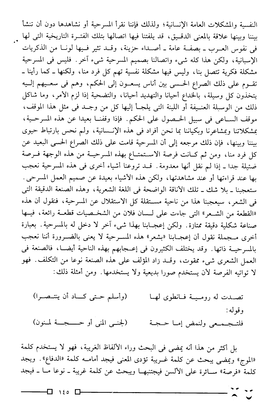 النفسية والمشكلات العامة الإنسانية؛ ولذلك فإننا نقرأ المسرحية أو نشاهدها دون أن تنشأ بيننا وبينها علاقة بالمعنى الدقيق، قد يلفتنا فيها اتصالها بتلك الفترة التاريخية التي لها في نفوس العرب -بصفة عامة- أصداء حزينة، وقد تثير فيها لونًا من الذكريات الإسبانية، ولكن هذا كله شيء واتصالنا بصميم المسرحية شيء آخر. فليس في المسرحية مشكلة فكرية تتصل بنا، وليس فيها مشكلة نفسية تهم كل فرد منا، ولكنها -كما رأينا- تقوم على ذلك الصراع الحسي بين أناس يسعون إلى الحكم، وهم في سعيهم إليه يتخذون كل وسيلة، بالخداع أحيانًا والتهديد أحيانًا، والتضحية إذا لزم الأمر، وما شاكل ذلك من الوسيلة العنيفة أو اللينة التي يلجأ إليها كل من وجد في مثل هذا الموقف، موقف الساعي في سبيل الحصول على الحكم. فإذا وقفنا بعيدًا عن هذه المسرحية، بمشكلاتنا وبمشاعرنا وبكياننا بما نحن أفراد في هذه الإنسانية، ولم نحس بارتباط حيوي بيننا وبينها، فإن ذلك مرجعه إلى أن المسرحية قامت على ذلك الصراع الحسي البعيد عن كل فرد منا، ومن ثم كانت فرصة الاستمتاع بهذه المسرحية من هذه الوجهة فرصة ضئيلة جدا, إذا لم نقل: إنها معدومة. قد تروعنا أشياء أخرى في هذه المسرحية نعجب بها عند قراءتها أو عند مشاهدتها، ولكن هذه الأشياء بعيدة عن صميم العمل المسرحي. ستعجبنا -بلا شك- تلك الأناقة الواضحة في اللغة الشعرية، وهذه الصنعة الدقيقة التي في الشعر، سيعجبنا هذا من ناحية مستقلة كل الاستقلال عن المسرحية، فنقول: إن هذه "القطعة من الشعر" التي جاءت على لسان فلان من الشخصيات قطعة رائعة، فيها صناعة شكلية دقيقة ممتازة, ولكن إعجابنا بهذا شيء آخر لا دخل له بالمسرحية. بعبارة أخرى مجملة نقول: إن إعجابنا "بشعر" هذه المسرحية لا يعني بالضرورة أننا نعجب بالمسرحية ذاتها, وقد يختلف الكثيرون في إعجابهم بهذه الناحية أيضًا، فالصنعة في العمل الشعري شيء ممقوت، وقد زاد المؤلف على هذه الصنعة نوعًا من التكلف, فهو لا تواتيه الفرصة لأن يستخدم صورًا بديعية ولا يستخدمها. ومن أمثلة ذلك: