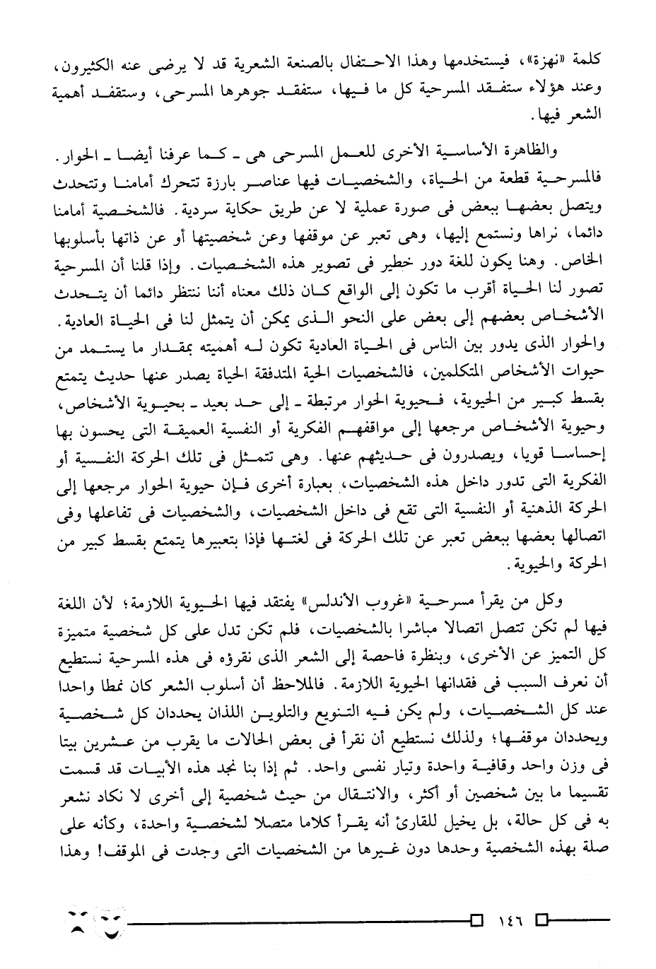 كلمة "نهزة"، فيستخدمها. وهذا الاحتفال بالصنعة الشعرية قد لا يرضى عنه الكثيرون، وعند هؤلاء ستفقد المسرحية كل ما فيها، ستفقد جوهرها المسرحي، وستفقد أهمية الشعر فيها.