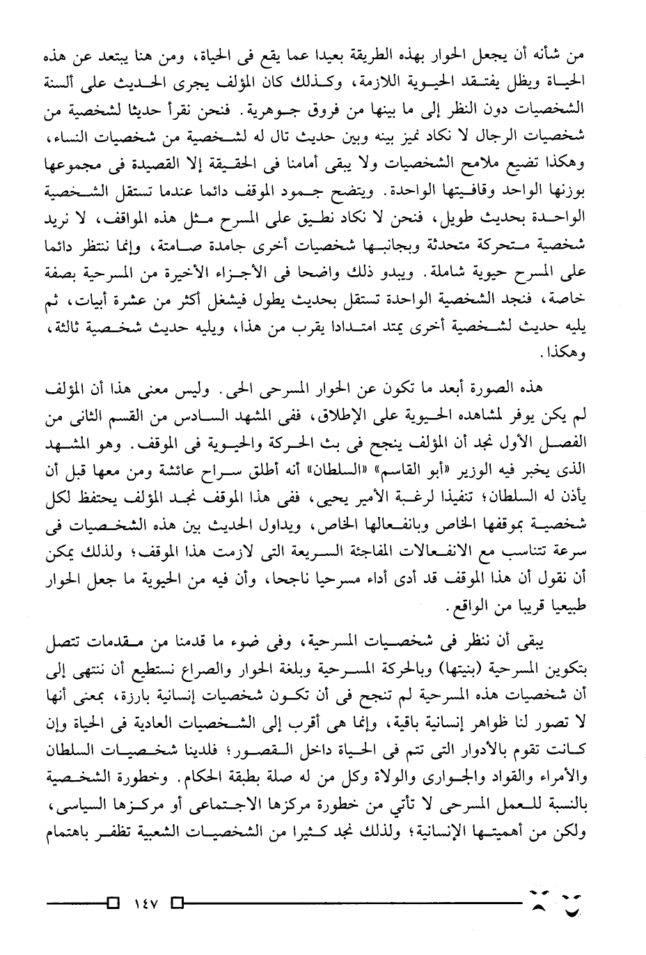 من شأنه أن يجعل الحوار بهذه الطريقة بعيدًا عما يقع في الحياة، ومن هنا يبتعد عن هذه الحياة ويظل يفتقد الحيوية اللازمة، وكذلك كان المؤلف يجري الحديث على ألسنة الشخصيات دون النظر إلى ما بينها من فروق جوهرية. فنحن نقرأ حديثًا لشخصية من شخصيات الرجال لا نكاد نميز بينه وبين حديث تال له لشخصية من شخصيات النساء، وهكذا تضيع ملامح الشخصيات ولا يبقى أمامنا في الحقيقة إلا القصيدة في مجموعها بوزنها الواحد وقافيتها الواحدة. ويتضح جمود الموقف دائمًا عندما تستقل الشخصية الواحدة بحديث طويل، فنحن لا نكاد نطيق على المسرح مثل هذه المواقف، لا نريد شخصية متحركة متحدثة وبجانبها شخصيات أخرى جامدة صامتة، وإنما ننتظر دائمًا على المسرح حيوية شاملة. ويبدو ذلك واضحًا في الأجزاء الأخيرة من المسرحية بصفة خاصة، فنجد الشخصية الواحدة تستقل بحديث يطول فيشغل أكثر من عشرة أبيات، ثم يليه حديث لشخصية أخرى يمتد امتدادًا يقرب من هذا، ويليه حديث شخصية ثالثة، وهكذا.