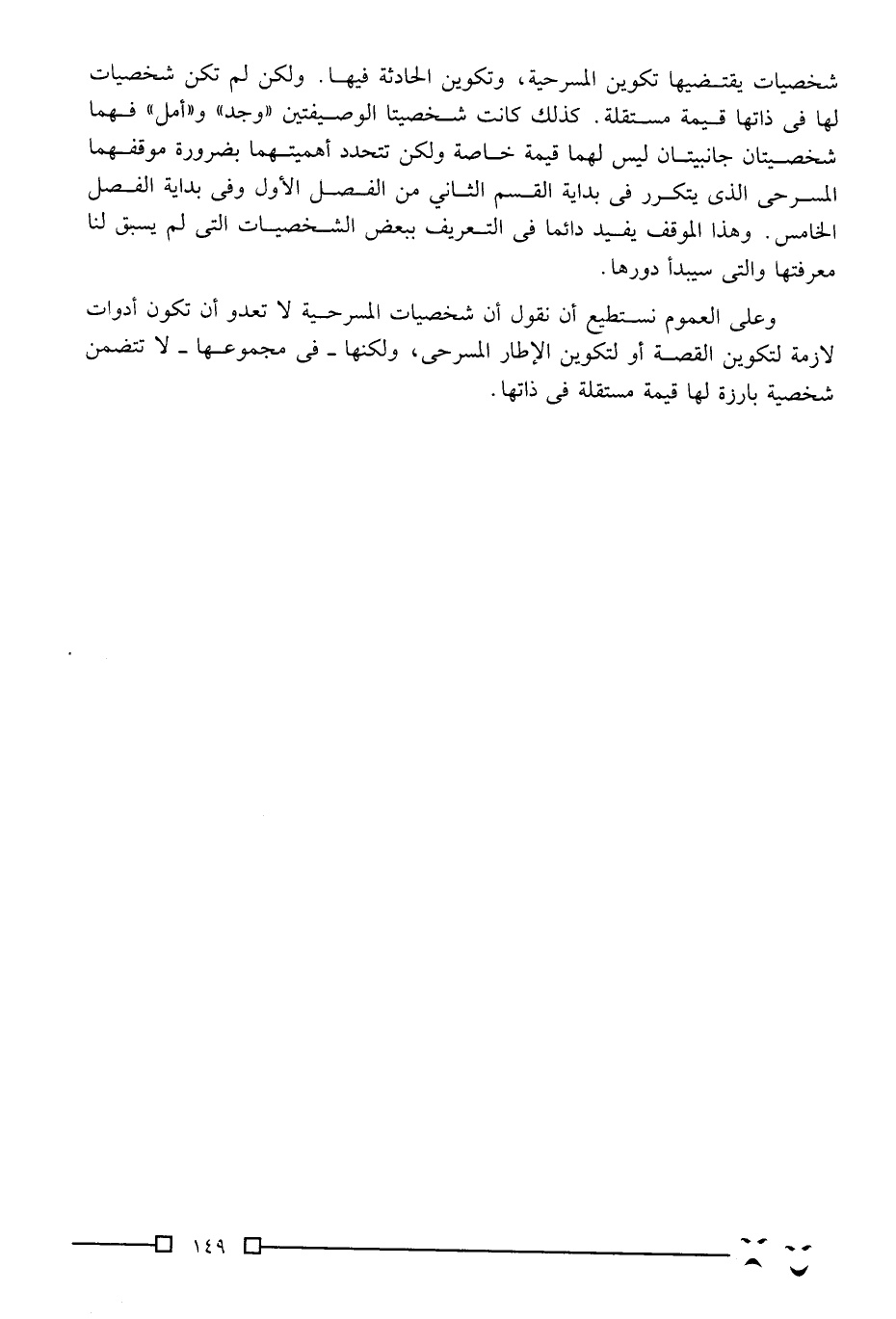وعلى العموم نستطيع أن نقول: إن شخصيات المسرحية لا تعدو أن تكون أدوات لازمة لتكوين القصة أو لتكوين الإطار المسرحي، ولكنها -في مجموعها- لا تتضمن شخصية بارزة لها قيمة مستقلة في ذاتها.