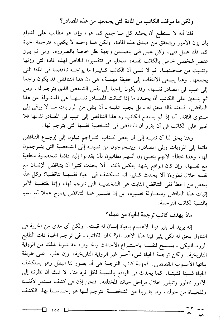 وهنا يحق لنا أن نتنبه إلى أن بعض كتاب التراجم يميلون إلى إرجاع التناقض دائمًا إلى المرويات وإلى المصادر، ويتحرجون من نسبته إلى الشخصية التي يترجمون لها، وهذا خطأ؛ لأنهم يتصورون أنهم مطالبون بأن يقدموا إلينا دائمًا شخصية منطقية مع نفسها، وإن كان الواقع يشهد بعكس ذلك. ألا يحدث كثيرًا أن يتناقض الإنسان مع نفسه خلال تطوره؟ ألا يحدث كثيرًا أننا نستكشف في الحياة نفسها تناقضا؟ وكل هذا يجعل من الخطأ نفي التناقض الثابت عن الشخصية التي نترجم لها، وإنما يقتضينا الأمر إثبات هذا التناقض ومحاولة تفسيره، بل إن تفسير هذا التناقض يصبح عملا أساسيا بالنسبة لكاتب الترجمة.