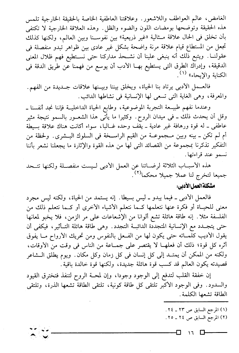 فالعمل الأدبي -فيما يبدو- ليس بسيطًا, إنه يستمد من الحياة، ولكنه ليس مجرد معنى للحياة أو فكرة عنها نتعلمها كما نتعلم الأشياء الأخرى أو كما نتعلم ذلك من الفلسفة مثلا. إنه طاقة هائلة تشع ألوانًا من الإشعاعات على مر الزمن، فلا يخبو لمعانها حتى يتجدد مع الإنسانية المتجددة الدائبة التجدد. وهي طاقة هائلة التأثير، فيكفي أن يقول الأديب كلماته حتى يكون لها من الفعل بالنفوس ومن تحريك الأرواح ما يفوق أثره كل قوة؛ ذلك أن فعلها لا يقتصر على جماعة من الناس في وقت من الأوقات، ولكنه من الممكن أن يمتد إلى كل إنسان في كل زمان وكل مكان. ويوم يطلق الشاعر قصيدته يكون العالم قد كسب قوة هائلة جديدة، ولكنها قوة خالدة باقية.