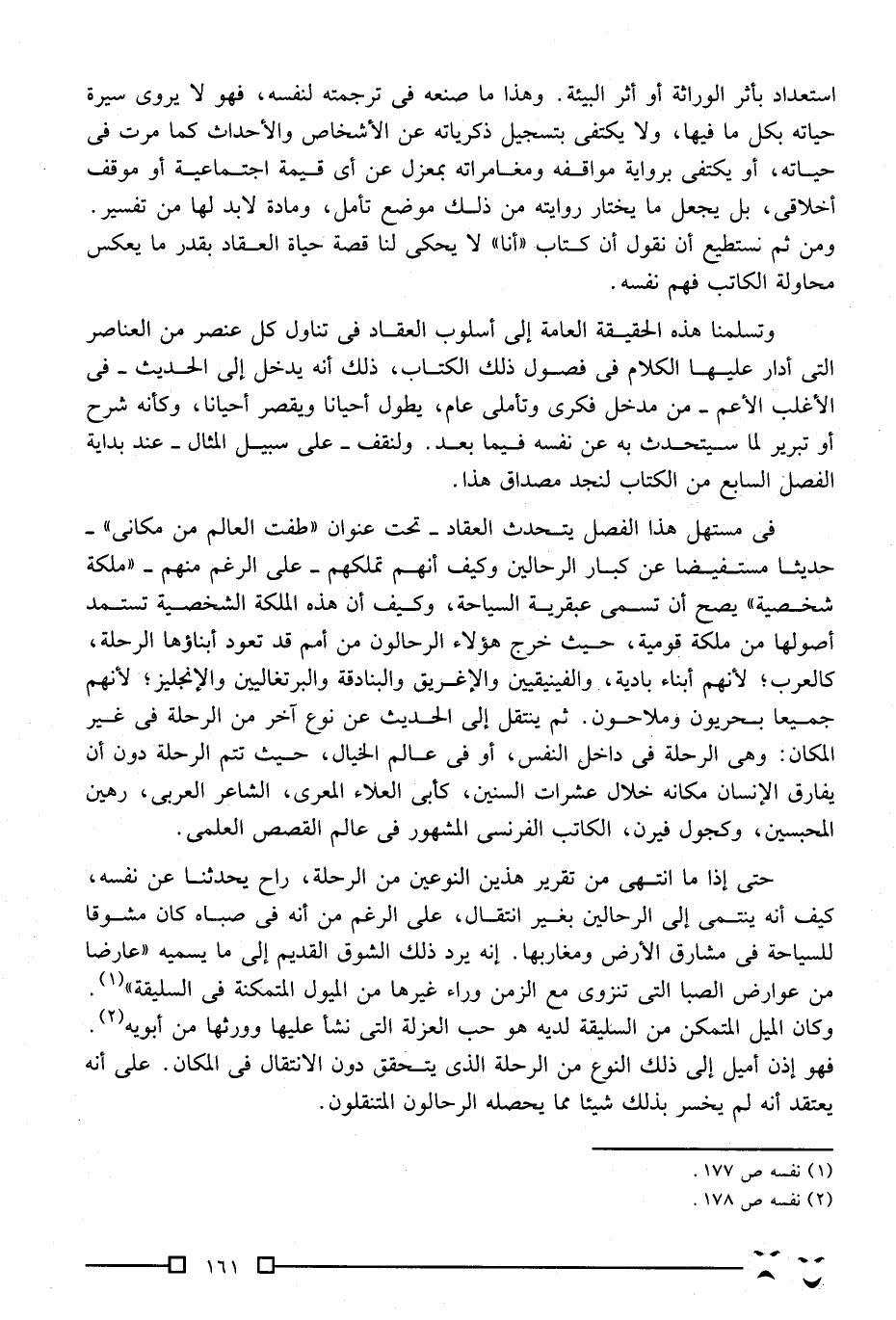 استعداد بأثر الوراثة أو أثر البيئة. وهذا ما صنعه في ترجمته لنفسه، فهو لا يروي سيرة حياته بكل ما فيها، ولا يكتفي بتسجيل ذكرياته عن الأشخاص والأحداث كما مرت في حياته، أو يكتفي برواية مواقفه ومغامراته بمعزل عن أي قيمة اجتماعية أو موقف أخلاقي، بل يجعل ما يختار روايته من ذلك موضع تأمل، ومادة لا بد لها من تفسير. ومن ثم نستطيع أن نقول: إن كتاب "أنا" لا يحكي لنا قصة حياة العقاد بقدر ما يعكس محاولة الكاتب فهم نفسه.