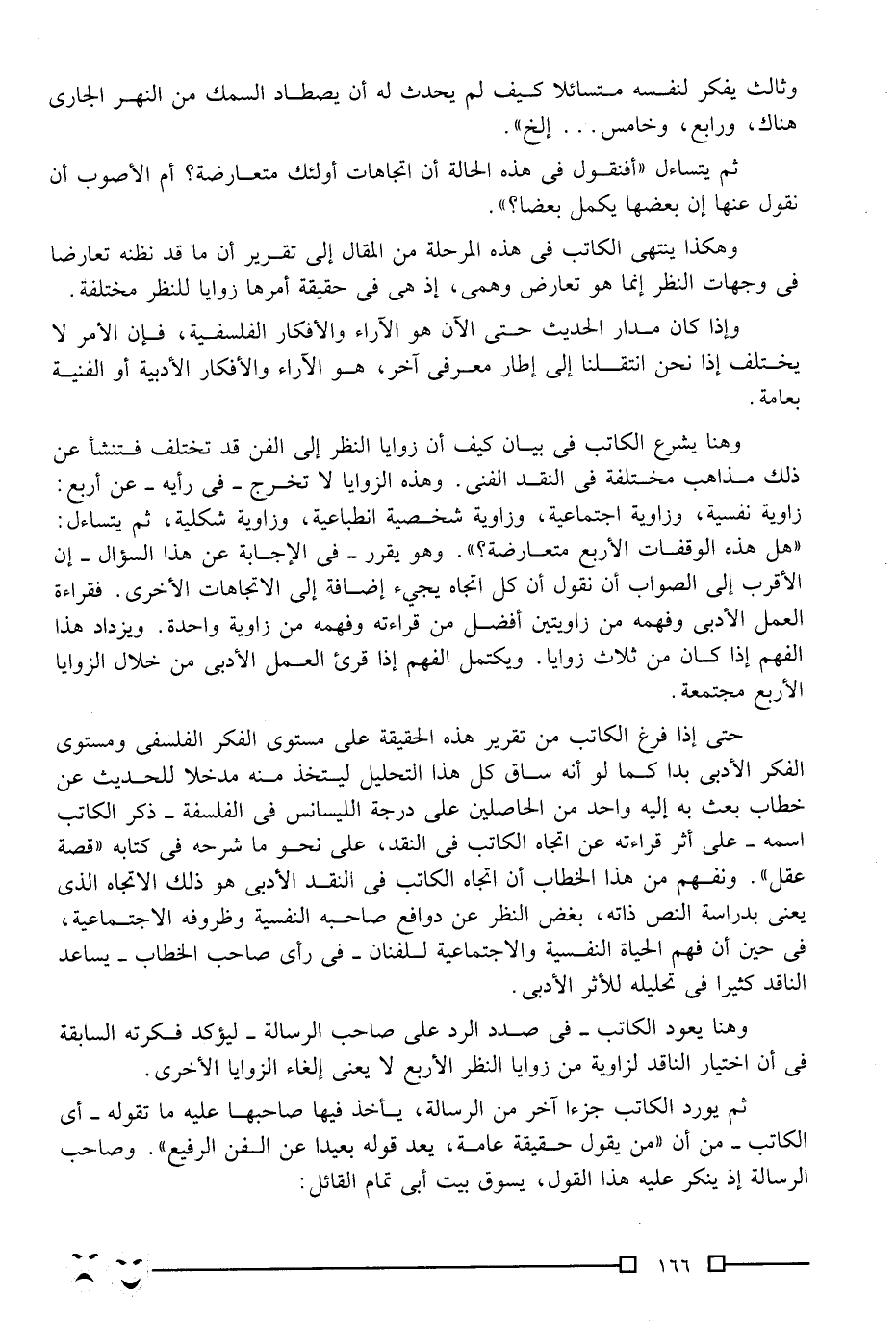 وهنا يشرع الكاتب في بيان كيف أن زوايا النظر إلى الفن قد تختلف فتنشأ عن ذلك مذاهب مختلفة في النقد الفني. وهذه الزوايا لا تخرج -في رأيه- عن أربع: زاوية نفسية، وزاوية اجتماعية، وزاوية شخصية انطباعية، وزاوية شكلية، ثم يتساءل: "هل هذه الوقفات الأربع متعارضة؟ ". وهو يقرر -في الإجابة عن هذا السؤال- أن الأقرب إلى الصواب أن نقول: إن كل اتجاه يجيء إضافة إلى الاتجاهات الأخرى, فقراءة العمل الأدبي وفهمه من زاويتين أفضل من قراءته وفهمه من زاوية واحدة. ويزداد هذا الفهم إذا كان من ثلاث زوايا, ويكتمل الفهم إذا قرئ العمل الأدبي من خلال الزوايا الأربع مجتمعة.
