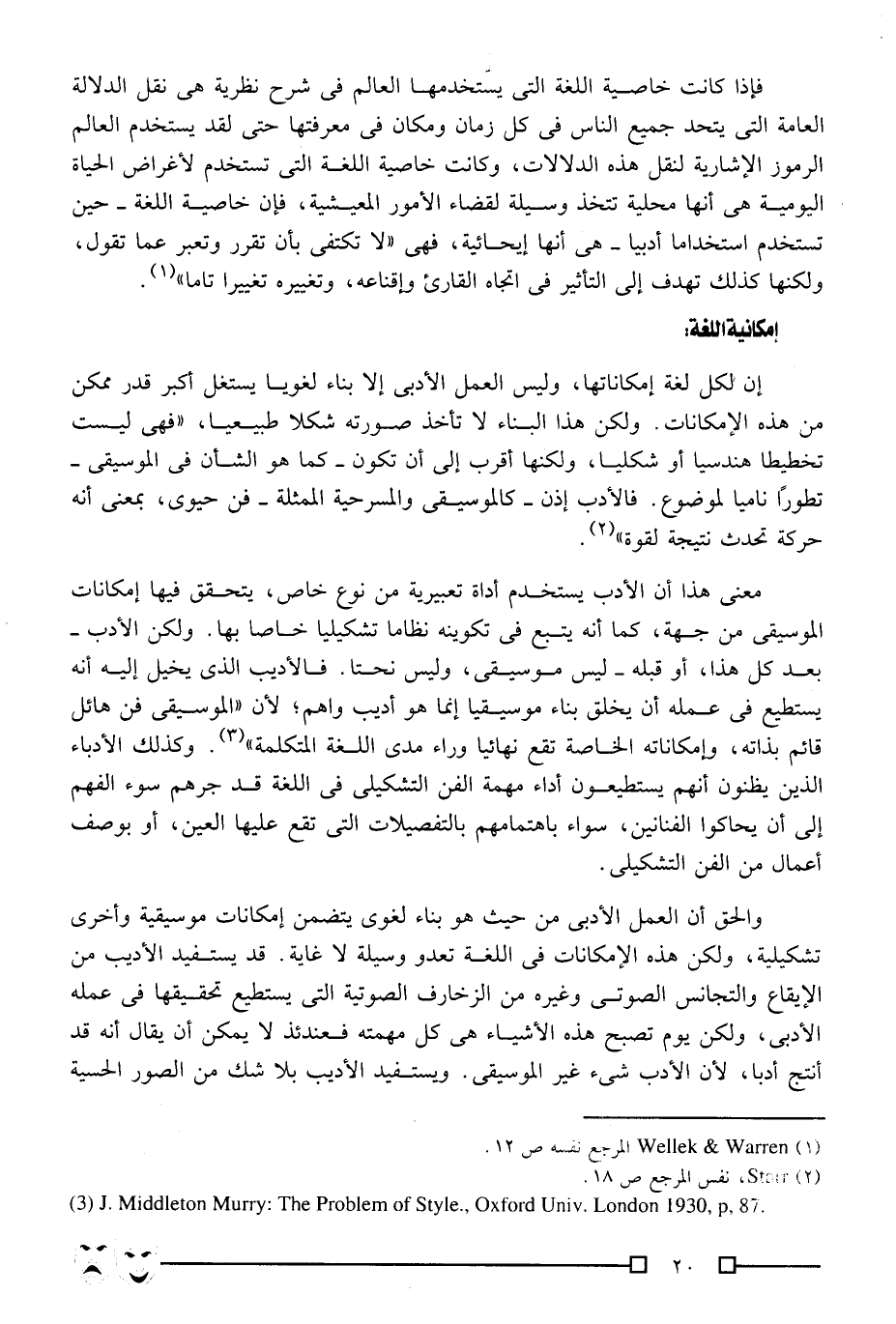 والحق أن العمل الأدبي من حيث هو بناء لغوي يتضمن إمكانات موسيقية وأخرى تشكيلية، ولكن هذه الإمكانات في اللغة تعدو وسيلة لا غاية. قد يستفيد الأديب من الإيقاع والتجانس الصوتي وغيره من الزخارف الصوتية التي يستطيع تحقيقها في عمله الأدبي، ولكن يوم تصبح هذه الأشياء هي كل مهمته فعندئذ لا يمكن أن يقال: إنه قد أنتج أدبًا؛ لأن الأدب شيء غير الموسيقى. ويستفيد الأديب بلا شك من الصور الحسية