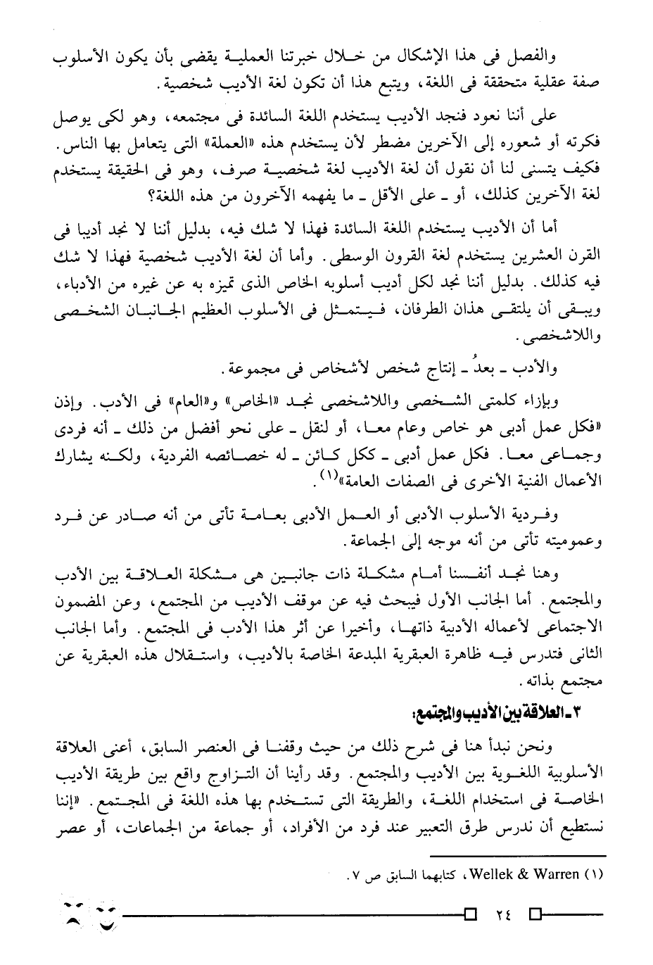 على أننا نعود فنجد الأديب يستخدم اللغة السائدة في مجتمعه، وهو لكي يوصل فكرته أو شعوره إلى الآخرين مضطر لأن يستخدم هذه "العملة" التي يتعامل بها الناس. فكيف يتسنى لنا أن نقول: إن لغة الأديب لغة شخصية صرف، وهو في الحقيقة يستخدم لغة الآخرين كذلك، أو -على الأقل- ما يفهمه الآخرون من هذه اللغة؟