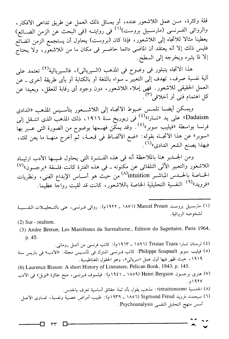 ومن الجدير هنا بالملاحظة أنه في هذه الفترة التي يحاول فيها الأدب ارتياد اللاشعور والتعبير الآلي التلقائي عن مكنونه, في هذه الفترة كانت فلسفة "برجسون"7 الخاصة بالحدس المباشر8 intuition من حيث هو أساس الإبداع الفني، ونظريات "فرويد"9 النفسية التحليلية الخاصة باللاشعور، كانت قد لقيت رواجًا عظيمًا.