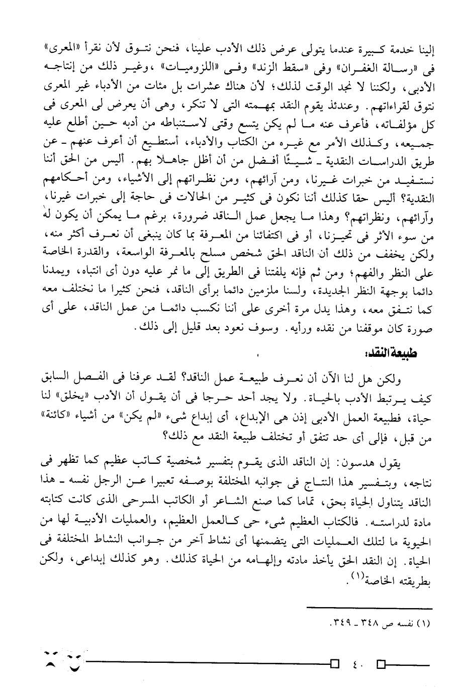 إلينا خدمة كبيرة عندما يتولى عرض ذلك الأدب علينا، فنحن نتوق لأن نقرأ "المعري" في "رسالة الغفران" وفي "سقط الزند" وفي "اللزوميات"، وغير ذلك من إنتاجه الأدبي، ولكننا لا نجد الوقت لذلك؛ لأن هناك عشرات بل مئات من الأدباء غير المعري نتوق لقراءاتهم. وعندئذ يقوم النقد بمهمته التي لا تنكر، وهي أن يعرض لي المعري في كل مؤلفاته، فأعرف عنه ما لم يكن يتسع قوتي لاستنباطه من أدبه حين أطلع عليه جميعه، وكذلك الأمر مع غيره من الكتاب والأدباء، أستطيع أن أعرف عنهم -عن طريق الدراسات النقدية- شيئًا أفضل من أن أظل جاهلا بهم. أليس من الحق أننا نستفيد من خبرات غيرنا، ومن آرائهم، ومن نظراتهم إلى الأشياء، ومن أحكامهم النقدية؟ أليس حقا كذلك أننا نكون في كثير من الحالات في حاجة إلى خبرات غيرنا، وآرائهم، ونظراتهم؟ وهذا ما يجعل عمل الناقد ضرورة، برغم ما يمكن أن يكون له من سوء الأثر في تحيزنا، أو في اكتفائنا من المعرفة بما كان ينبغي أن نعرف أكثر منه، ولكن يخفف من ذلك أن الناقد الحق شخص مسلح بالمعرفة الواسعة، والقدرة الخاصة على النظر والفهم؛ ومن ثم فإنه يلفتنا في الطريق إلى ما نمر عليه دون أي انتباه، ويمدنا دائمًا بوجهة النظر الجديدة، ولسنا ملزمين دائمًا برأي الناقد، فنحن كثيرًا ما نختلف معه كما نتفق معه، وهذا يدل مرة أخرى على أننا نكسب دائمًا من عمل الناقد، على أي صورة كان موقفنا من نقده ورأيه. وسوف نعود بعد قليل إلى ذلك.
