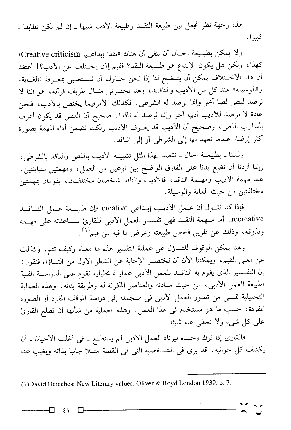ولا يمكن بطبيعة الحال أن ننفي أن هناك "نقدًا إبداعيًّا Creative criticism" كهذا، ولكن هل يكون الإبداع هو طبيعة النقد؟ ففيمَ إذن يختلف عن الأدب؟! أعتقد أن هذا الاختلاف يمكن أن يتضح لنا إذا نحن حاولنا أن نستعين بمعرفة "الغاية" و"الوسيلة" عند كل من الأديب والناقد، وهنا يحضرني مثال طريف قرأته، هو أننا لا نرصد للص لصا آخر وإنما نرصد له الشرطي, فكذلك الأمر فيما يختص بالأدب، فنحن عادة لا نرصد للأديب أديبًا آخر وإنما نرصد له ناقدًا. صحيح أن اللص قد يكون أعرف بأساليب اللص، وصحيح أن الأديب قد يعرف الأديب ولكننا نضمن أداء المهمة بصورة أكثر إرضاء عندما نعهد بها إلى الشرطي أو إلى الناقد.