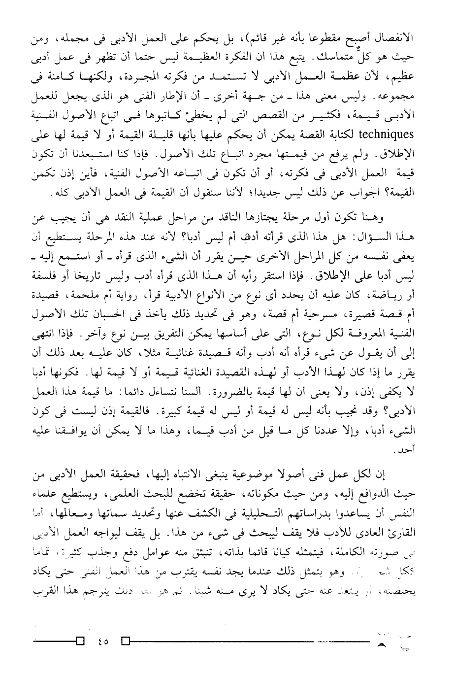 فلسفة الناقد الخاصة التي يتخذ منها معيارًا لقيمة العمل الأدبي لا بد أن تكون فلسفة عقلية فنية في وقت معًا, إذا صح هذا التعبير, أعني أن يدخل الناقد في اعتباره -حين يصدر حكمه- كيف تحققت فكرة القصة -مثلا- تحققًا فنيًّا، فهو عندئذ لا يحكم على صورة العمل الأدبي مستقلة، أو على مضمونه منفصلًا عن صورته "فهذا الانفصال أصبح مقطوعًا بأنه غير قائم"، بل يحكم على العمل الأدبي في مجمله، ومن حيث هو كلٌّ متماسك. يتبع هذا أن الفكرة العظيمة ليس حتمًا أن تظهر في عمل أدبي عظيم؛ لأن عظمة العمل الأدبي لا تستمد من فكرته المجردة، ولكنها كامنة في مجموعه, وليس معنى هذا -من جهة أخرى- أن الإطار الفني هو الذي يجعل للعمل الأدبي قيمة، فكثير من القصص التي لم يخطئ كاتبوها في اتباع الأصول الفنية techniques لكتابة القصة يمكن أن يحكم عليها بأنها قليلة القيمة أو لا قيمة لها على الإطلاق, ولم يرفع من قيمتها مجرد اتباع تلك الأصول. فإذا كنا استبعدنا أن تكون قيمة العمل الأدبي في فكرته، أو أن تكون في اتباعه الأصول الفنية، فأين إذن تكمن القيمة؟ الجواب عن ذلك ليس جديدًا؛ لأننا سنقول: إن القيمة في العمل الأدبي كله.