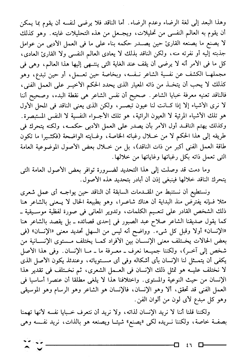 ونستطيع أن نستنبط من المقدمات السابقة أن الناقد حين يواجه أي عمل شعري مثلا, فإنه يفترض منذ البداية أن هناك شاعرًا، وهو بطبيعة الحال لا يعني بالشاعر هنا ذلك الشخص القادر على تنغيم الكلمات، وتدوير المعاني في صورة لفظية موسيقية -كما يقول صديقنا الشاعر صلاح عبد الصبور في إحدى قصائده- بل يقصد بالشاعر هنا "الإنسان" أولا وقبل كل شيء. وواضح أنه ليس من السهل تحديد معنى "الإنسان" "في بعض الحالات يختلف معنى الإنسان بين الأفراد كما يختلف مستوى الإنسانية من شخص إلى آخر"، ولكننا جميعًا نعرف -معرفة ما- ما الإنسان. وفي هذا الأصل يكفي أن يتمثل لنا الإنسان بأي أشكاله وفي أي مستوياته، وعندئذ يكون الأصل الذي لا نختلف عليه هو تمثل ذلك الإنسان في العمل الشعري، ثم نختلف في تقدير هذا الإنسان من حيث النوعية والمستوى. واختلافنا هذا لا يلغي مطلقًا أن عنصرًا أساسيًّا في العمل الفني قد تحقق، ألا وهو الإنسان، فالإنسان هو الشاعر وهو الرسام وهو الموسيقي وهو كل مبدع لأي لون من ألوان الفن.