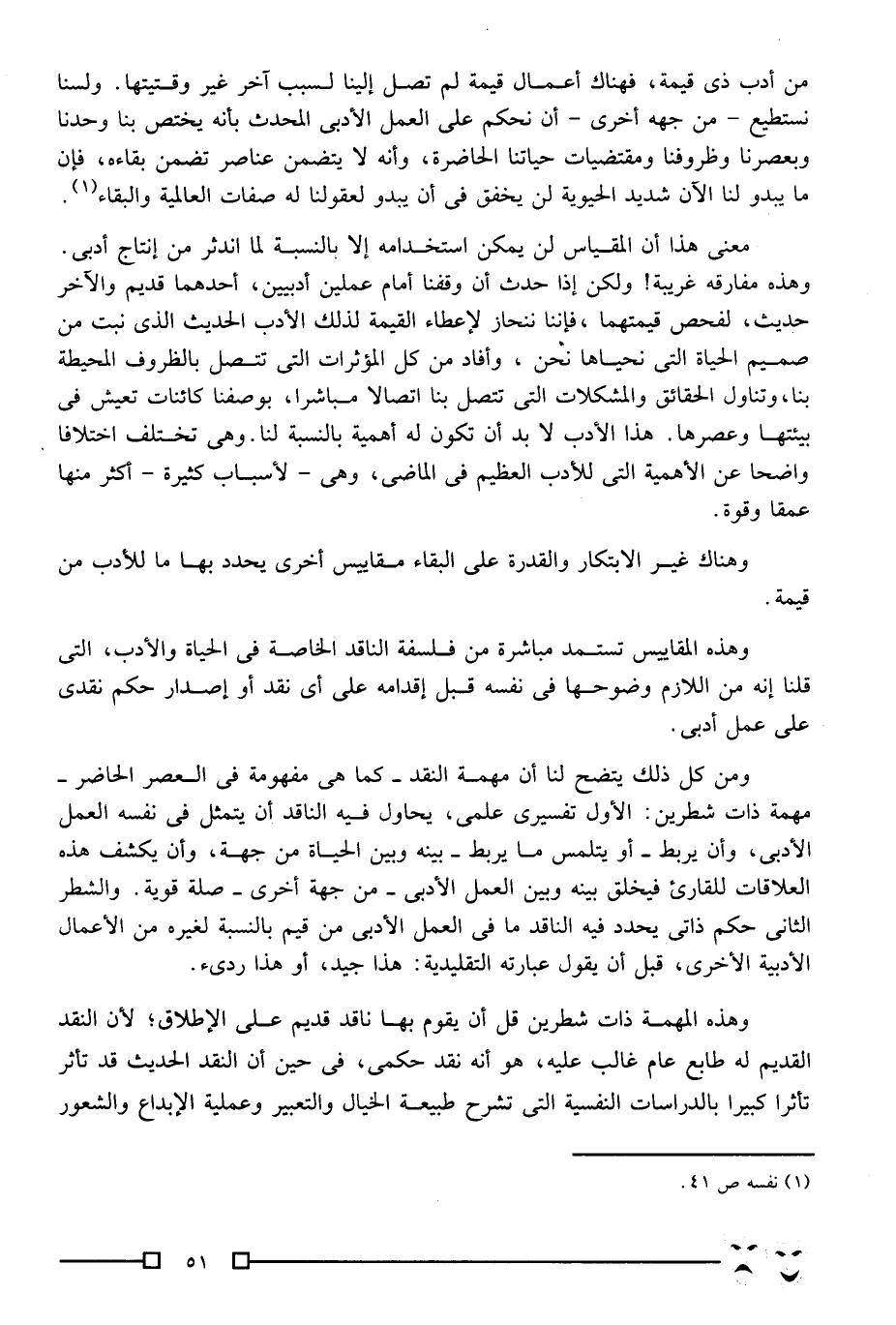 ومن كل ذلك يتضح لنا أن مهمة النقد -كما هي مفهومة في العصر الحاضر- مهمة ذات شطرين: الأول تفسيري علمي، يحاول فيه الناقد أن يتمثل في نفسه العمل الأدبي، وأن يربط -أو يتلمس ما يربط- بينه وبين الحياة من جهة، وأن يكشف هذه العلاقات للقارئ فيخلق بينه وبين العمل الأدبي -من جهة أخرى- صلة قوية. والشطر الثاني حكم ذاتي يحدد فيه الناقد ما في العمل الأدبي من قيم بالنسبة لغيره من الأعمال الأدبية الأخرى، قبل أن يقول عبارته التقليدية: هذا جيد، أو هذا رديء.