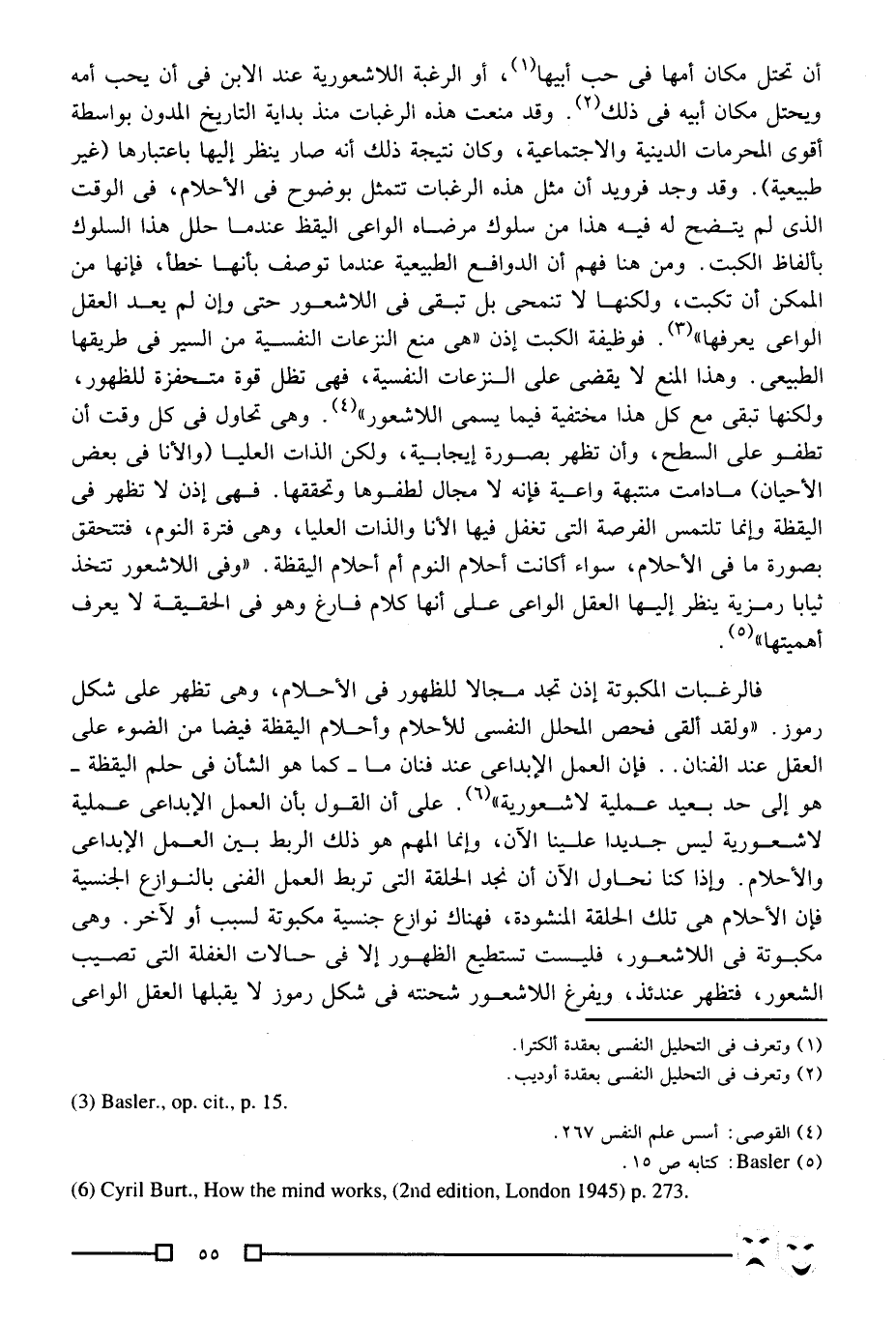 أن تحتل مكان أمها في حب أبيها1، أو الرغبة اللاشعورية عند الابن في أن يحب أمه ويحتل مكان أبيه في ذلك2. وقد منعت هذه الرغبات منذ بداية التاريخ المدون بواسطة أقوى المحرمات الدينية والاجتماعية، وكانت نتيجة ذلك أنه صار ينظر إليها باعتبارها "غير طبيعية". وقد وجد فرويد أن مثل هذه الرغبات تتمثل بوضوح في الأحلام، في الوقت الذي لم يتضح له فيه هذا من سلوك مرضاه الواعي اليقظ عندما حلل هذا السلوك بألفاظ الكبت. ومن هنا فهم أن الدوافع الطبيعية عندما توصف بأنها خطأ، فإنها من الممكن أن تكبت، ولكنها لا تنمحي بل تبقى في اللاشعور حتى وإن لم يعد العقل الواعي يعرفها3. فوظيفة الكبت إذن "هي منع النزعات النفسية من السير في طريقها الطبيعي. وهذا المنع لا يقضي على النزعات النفسية، فهي تظل قوة متحفزة للظهور، ولكنها تبقى مع كل هذا مختفية فيما يسمى اللاشعور"4. وهي تحاول في كل وقت أن تطفو على السطح، وأن تظهر بصورة إيجابية، ولكن الذات العليا "والأنا في بعض الأحيان" ما دامت منتبهة واعية فإنه لا مجال لطفوها وتحققها. فهي إذن لا تظهر في اليقظة وإنما تلتمس الفرصة التي تغفل فيها الأنا والذات العليا، وهي فترة النوم، فتتحقق بصورة ما في الأحلام، سواء أكانت أحلام النوم أم أحلام اليقظة. "وفي اللاشعور تتخذ ثيابًا رمزية ينظر إليها العقل الواعي على أنها كلام فارغ, وهو في الحقيقة لا يعرف أهميتها"5.