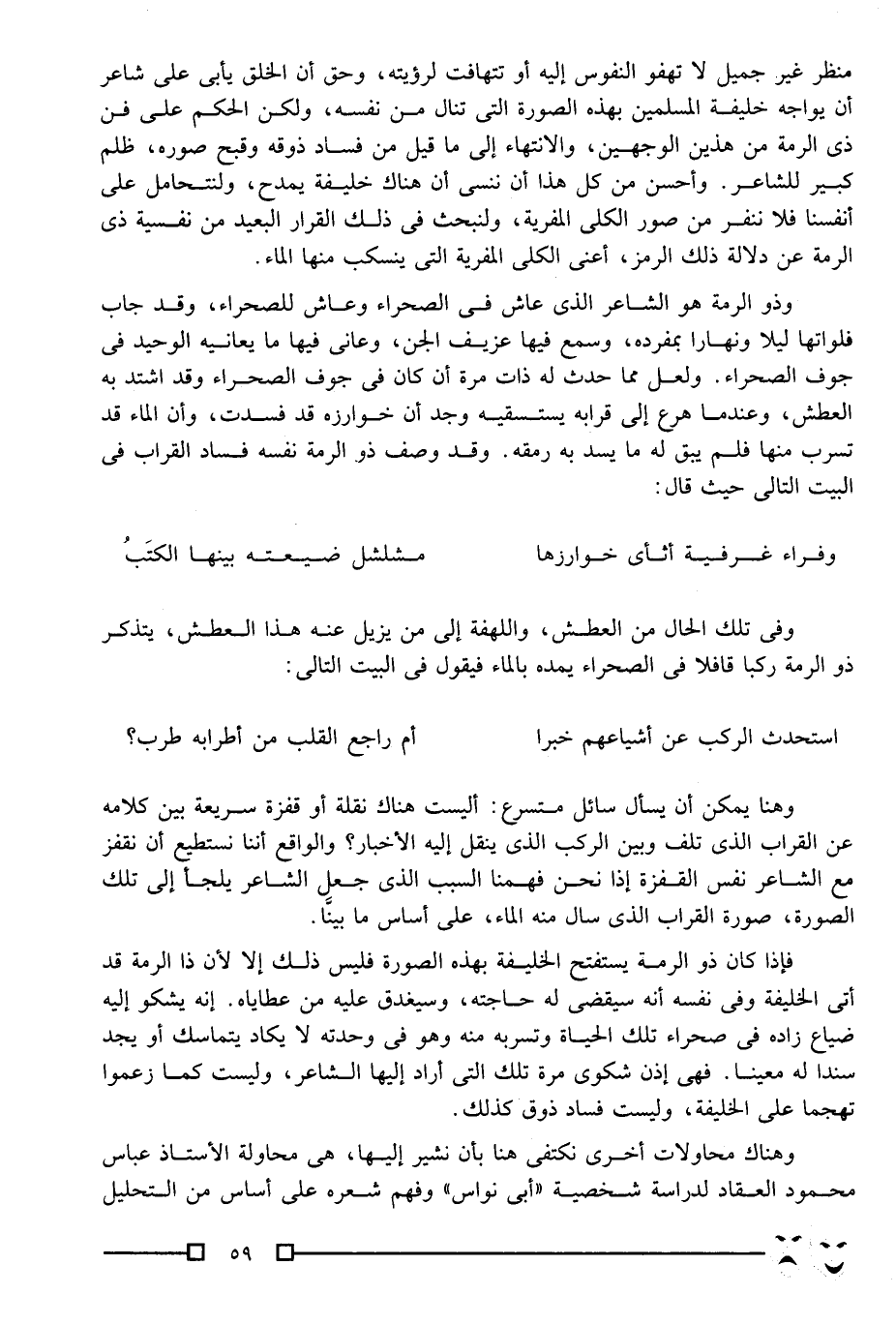 منظر غير جميل لا تهفو النفوس إليه أو تتهافت لرؤيته، وحق أن الخلق يأبى على شاعر أن يواجه خليفة المسلمين بهذه الصورة التي تنال من نفسه، ولكن الحكم على فن ذي الرمة من هذين الوجهين، والانتهاء إلى ما قيل من فساد ذوقه وقبح صوره، ظلم كبير للشاعر. وأحسن من كل هذا أن ننسى أن هناك خليفة يمدح، ولنتحامل على أنفسنا فلا ننفر من صور الكلى المفرية، ولنبحث في ذلك القرار البعيد من نفسية ذي الرمة عن دلالة ذلك الرمز، أعني الكلى المفرية التي ينسكب منها الماء.