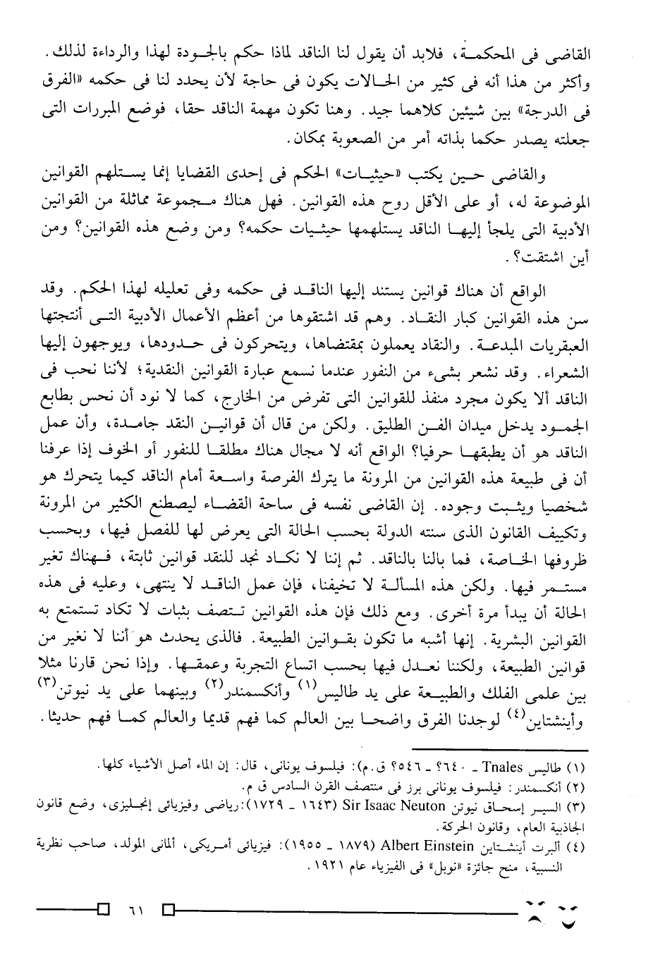 الواقع أن هناك قوانين يستند إليها الناقد في حكمه وفي تعليله لهذا الحكم, وقد سن هذه القوانين كبار النقاد, وهم قد اشتقوها من أعظم الأعمال الأدبية التي أنتجتها العبقريات المبدعة, والنقاد يعملون بمقتضاها، ويتحركون في حدودها، ويوجهون إليها الشعراء. وقد نشعر بشيء من النفور عندما نسمع عبارة القوانين النقدية؛ لأننا نحب في الناقد ألا يكون مجرد منفذ للقوانين التي تفرض من الخارج، كما لا نود أن نحس بطابع الجمود يدخل ميدان الفن الطليق. ولكن من قال: إن قوانين النقد جامدة، وإن عمل الناقد هو أن يطبقها حرفيا؟ الواقع أنه لا مجال هناك مطلقًا للنفور أو الخوف إذا عرفنا أن في طبيعة هذه القوانين من المرونة ما يترك الفرصة واسعة أمام الناقد كيما يتحرك هو شخصيا ويثبت وجوده. إن القاضي نفسه في ساحة القضاء ليصطنع الكثير من المرونة وتكييف القانون الذي سنته الدولة بحسب الحالة التي يعرض لها للفصل فيها، وبحسب ظروفها الخاصة، فما بالنا بالناقد. ثم إننا لا نكاد نجد للنقد قوانين ثابتة، فهناك تغير مستمر فيها, ولكن هذه المسألة لا تخيفنا، فإن عمل الناقد لا ينتهي، وعليه في هذه الحالة أن يبدأ مرة أخرى. ومع ذلك فإن هذه القوانين تتصف بثبات لا تكاد تستمتع به القوانين البشرية, إنها أشبه ما تكون بقوانين الطبيعة. فالذي يحدث هو أننا لا نغير من قوانين الطبيعة، ولكننا نعدل فيها بحسب اتساع التجربة وعمقها. وإذا نحن قارنا مثلا بين علمي الفلك والطبيعة على يد طاليس1 وأنكسمندر2, وبينهما على يد نيوتن3 وأينشتاين4 لوجدنا الفرق واضحًا بين العالم كما فهم قديمًا والعالم كما فهم حديثًا.