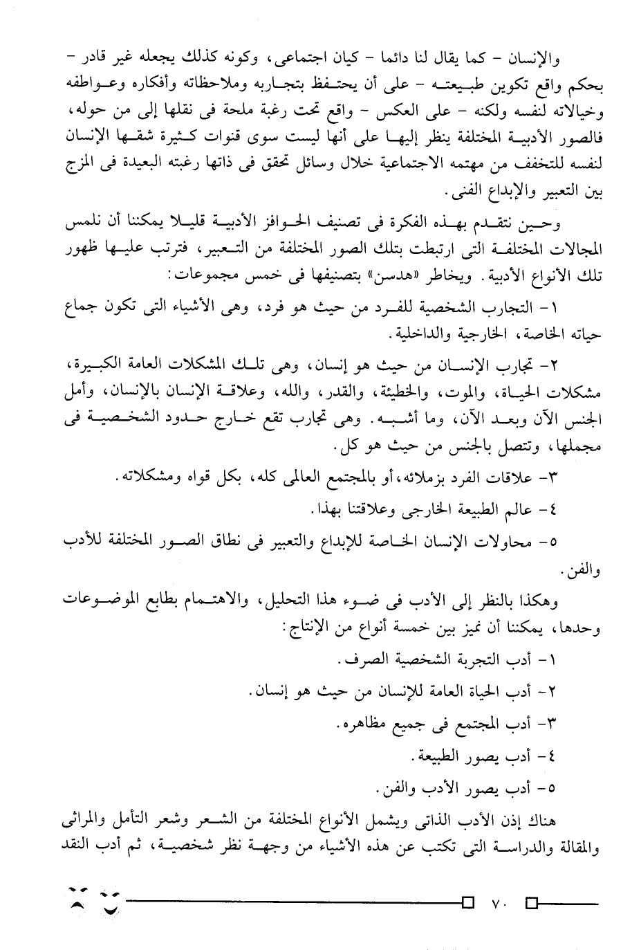 وهكذا بالنظر إلى الأدب في ضوء هذا التحليل، والاهتمام بطابع الموضوعات وحدها، يمكننا أن نميز بين خمسة أنواع من الإنتاج: