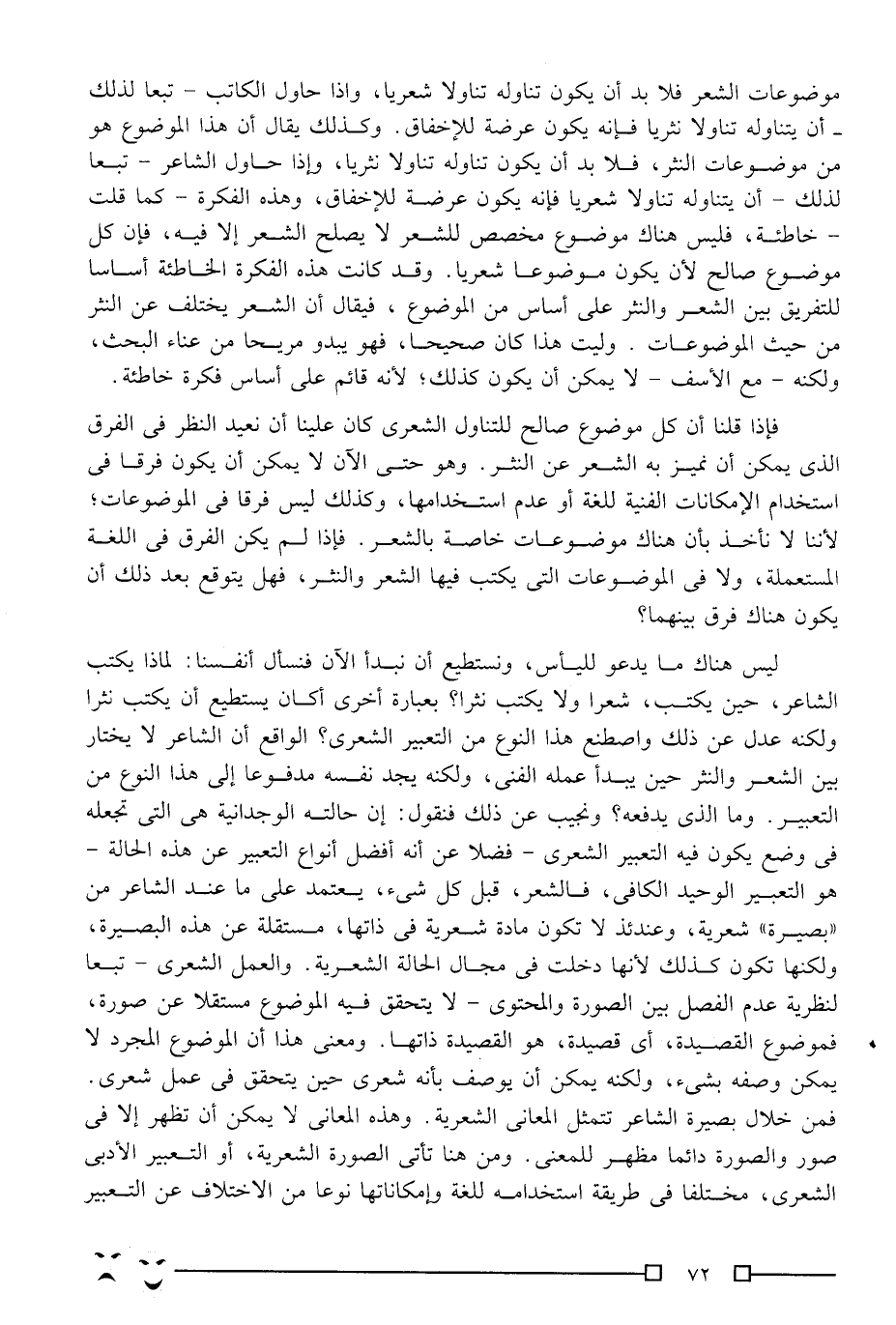 فإذا قلنا: إن كل موضوع صالح للتناول الشعري, كان علينا أن نعيد النظر في الفرق الذي يمكن أن نميز به الشعر عن النثر. وهو حتى الآن لا يمكن أن يكون فرقا في استخدام الإمكانات الفنية للغة أو عدم استخدامها، وكذلك ليس فرقًا في الموضوعات؛ لأننا لا نأخذ بأن هناك موضوعات خاصة بالشعر. فإذا لم يكن الفرق في اللغة المستعملة، ولا في الموضوعات التي يكتب فيها الشعر والنثر، فهل يتوقع بعد ذلك أن يكون هناك فرق بينهما؟