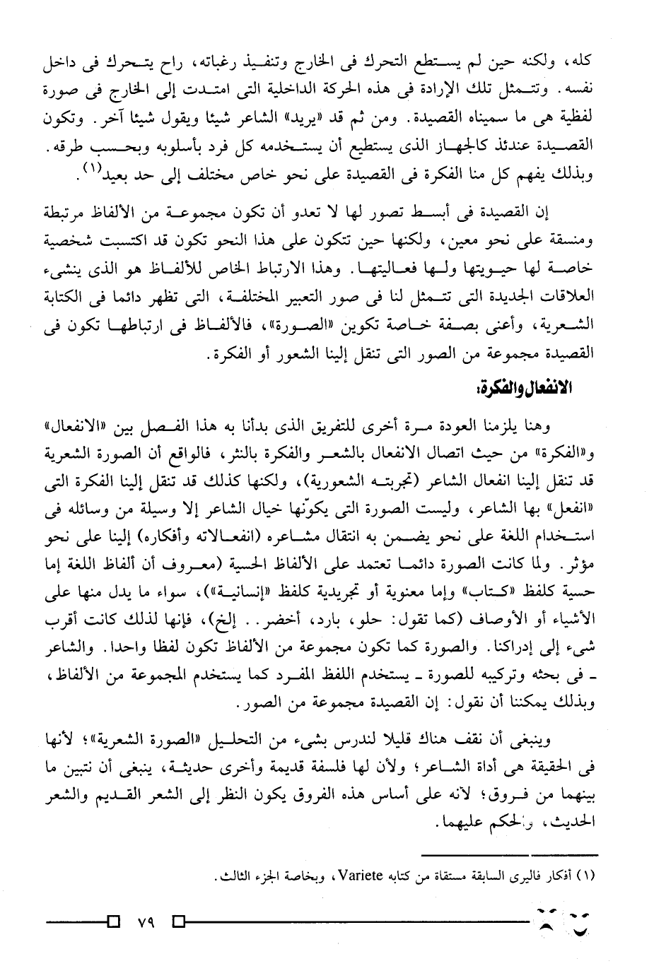 إن القصيدة في أبسط تصور لها لا تعدو أن تكون مجموعة من الألفاظ مرتبطة ومنسقة على نحو معين، ولكنها حين تتكون على هذا النحو تكون قد اكتسبت شخصية خاصة لها حيويتها ولها فعاليتها. وهذا الارتباط الخاص للألفاظ هو الذي ينشئ العلاقات الجديدة التي تتمثل لنا في صور التعبير المختلفة، التي تظهر دائمًا في الكتابة الشعرية، وأعني بصفة خاصة تكوين "الصورة"، فالألفاظ في ارتباطها تكون في القصيدة مجموعة من الصور التي تنقل إلينا الشعور أو الفكرة.