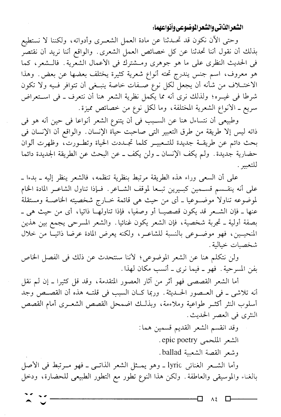 ولن نتكلم هنا عن الشعر الموضوعي؛ لأننا سنتحدث عن ذلك في الفصل الخاص بفن المسرحية, فهو -فيما نرى- أنسب مكان لهذا.