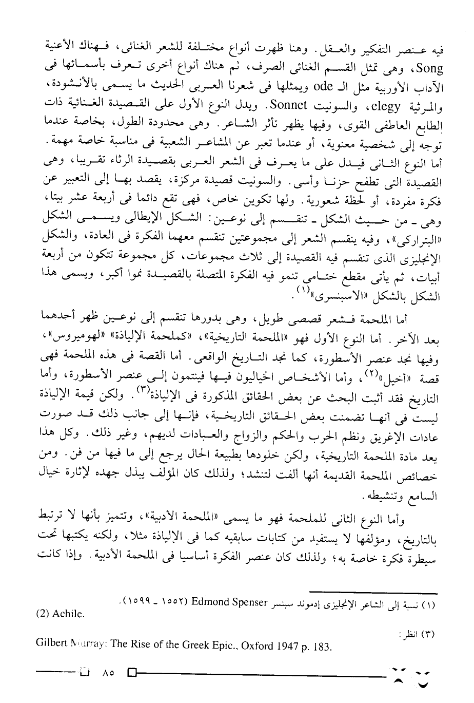 أما الملحمة فشعر قصصي طويل، وهي بدورها تنقسم إلى نوعين ظهر أحدهما بعد الآخر. أما النوع الأول فهو "الملحمة التاريخية"، "كملحمة الإلياذة" "لهوميروس"، وفيها نجد عنصر الأسطورة، كما نجد التاريخ الواقعي. أما القصة في هذه الملحمة فهي قصة "أخيل"2، وأما الأشخاص الخياليون فيها فينتمون إلى عنصر الأسطورة، وأما التاريخ فقد أثبت البحث عن بعض الحقائق المذكورة في الإلياذة3, ولكن قيمة الإلياذة ليست في أنها تضمنت بعض الحقائق التاريخية، فإنها إلى جانب ذلك قد صورت عادات الإغريق ونظم الحرب والحكم والزواج والعبادات لديهم، وغير ذلك. وكل هذا يعد مادة الملحمة التاريخية، ولكن خلودها بطبيعة الحال يرجع إلى ما فيها من فن. ومن خصائص الملحمة القديمة أنها ألفت لتنشد؛ ولذلك كان المؤلف يبذل جهده لإثارة خيال السامع وتنشيطه.