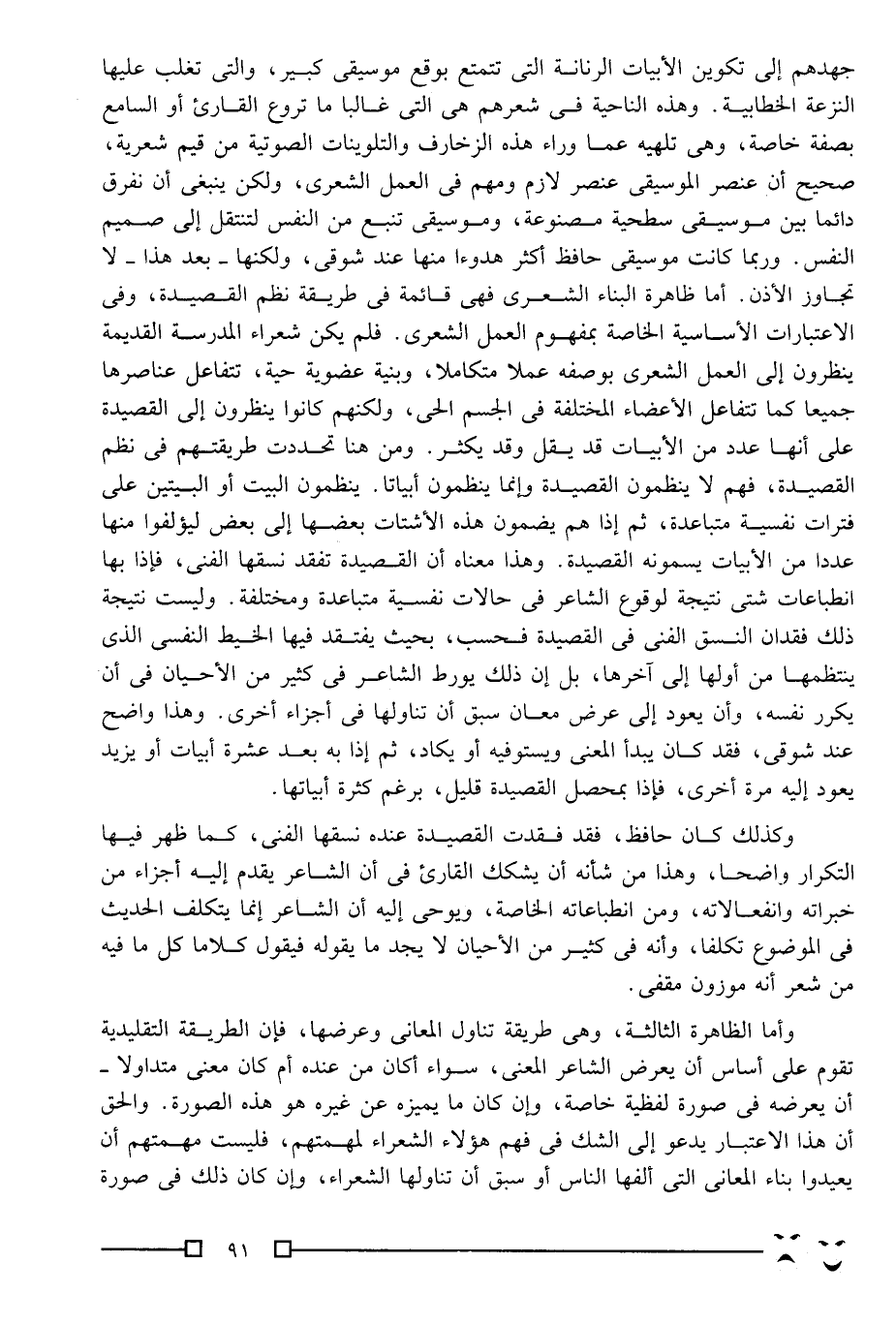جهدهم إلى تكوين الأبيات الرنانة التي تتمتع بوقع موسيقي كبير، والتي تغلب عليها النزعة الخطابية. وهذه الناحية في شعرهم هي التي غالبًا ما تروع القارئ أو السامع بصفة خاصة، وهي تلهيه عما وراء هذه الزخارف والتلوينات الصوتية من قيم شعرية، صحيح أن عنصر الموسيقى عنصر لازم ومهم في العمل الشعري، ولكن ينبغي أن نفرق دائمًا بين موسيقى سطحية مصنوعة، وموسيقى تنبع من النفس لتنتقل إلى صميم النفس. وربما كانت موسيقى حافظ أكثر هدوءًا منها عند شوقي، ولكنها -بعد هذا- لا تجاوز الأذن. أما ظاهرة البناء الشعري فهي قائمة في طريقة نظم القصيدة، وفي الاعتبارات الأساسية الخاصة بمفهوم العمل الشعري. فلم يكن شعراء المدرسة القديمة ينظرون إلى العمل الشعري بوصفه عملا متكاملا، وبنية عضوية حية، تتفاعل عناصرها جميعًا كما تتفاعل الأعضاء المختلفة في الجسم الحي، ولكنهم كانوا ينظرون إلى القصيدة على أنها عدد من الأبيات قد يقل وقد يكثر. ومن هنا تحددت طريقتهم في نظم القصيدة، فهم لا ينظمون القصيدة وإنما ينظمون أبياتًا. ينظمون البيت أو البيتين على فترات نفسية متباعدة، ثم إذا هم يضمون هذه الأشتات بعضها إلى بعض ليؤلفوا منها عددًا من الأبيات يسمونه القصيدة. وهذا معناه أن القصيدة تفقد نسقها الفني، فإذا بها انطباعات شتى نتيجة لوقوع الشاعر في حالات نفسية متباعدة ومختلفة. وليست نتيجة ذلك فقدان النسق الفني في القصيدة فحسب، بحيث يفتقد فيها الخيط النفسي الذي ينتظمها من أولها إلى آخرها، بل إن ذلك يورط الشاعر في كثير من الأحيان في أن يكرر نفسه، وأن يعود إلى عرض معانٍ سبق أن تناولها في أجزاء أخرى. وهذا واضح عند شوقي، فقد كان يبدأ المعنى ويستوفيه أو يكاد، ثم إذا به بعد عشرة أبيات أو يزيد يعود إليه مرة أخرى، فإذا بمحصل القصيدة قليل، برغم كثرة أبياتها.