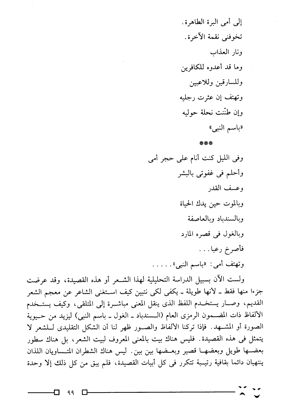 ولست الآن بسبيل الدراسة التحليلية لهذا الشعر أو هذه القصيدة، وقد عرضت جزءًا منها فقط -لأنها طويلة- يكفي لكي نتبين كيف استغنى الشاعر عن معجم الشعر القديم، وصار يستخدم اللفظ الذي ينقل المعنى مباشرة إلى المتلقي، وكيف يستخدم الألفاظ ذات المضمون الرمزي العام "السندباد، الغول، باسم النبي" ليزيد من حيوية الصورة أو المشهد. فإذا تركنا الألفاظ والصور ظهر لنا أن الشكل التقليدي للشعر لا يتمثل في هذه القصيدة. فليس هناك بيت بالمعنى المعروف لبيت الشعر، بل هناك سطور بعضها طويل وبعضها قصير وبعضها بين بين. ليس هناك الشطران المتساويان اللذان ينتهيان دائمًا بقافية رتيبة تتكرر في كل أبيات القصيدة، فلم يبق من كل ذلك إلا وحدة