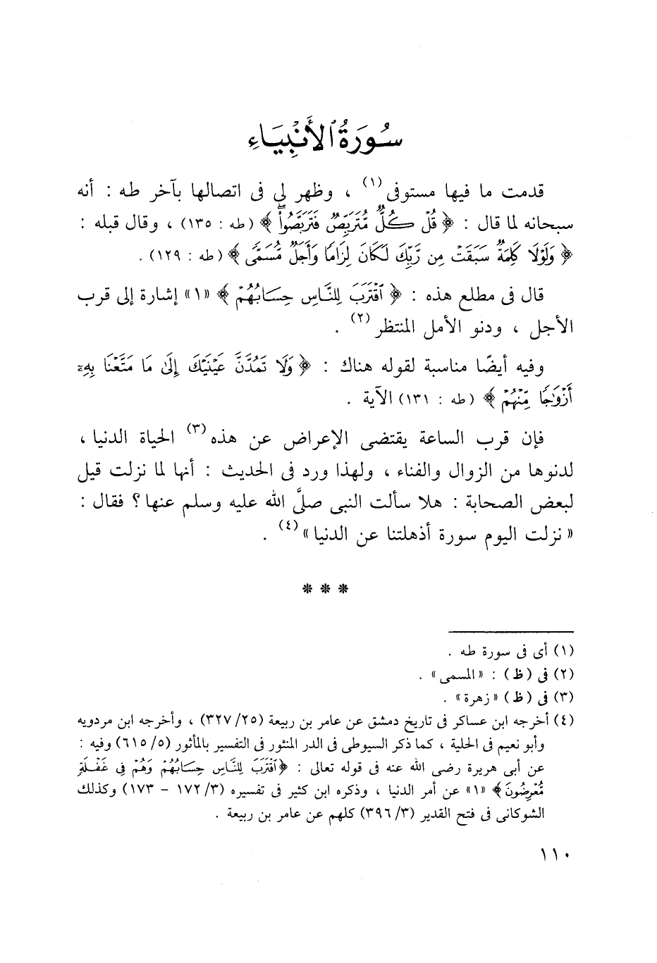 قال في مطلع هذه: {اقْتَرَبَ لِلنَّاسِ حِسَابُهُمْ} "1" إشارة إلى قرب الأجل، ودنو الأمل المنتظر2.
