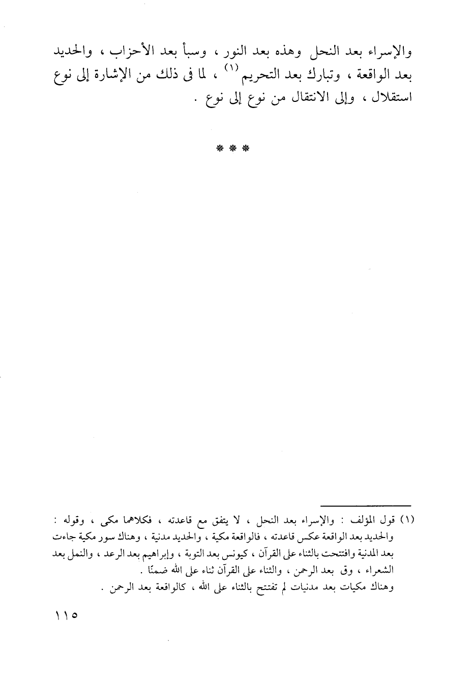 1 قول المؤلف: والإسراء بعد النحل، لا يتفق مع قاعدته، فكلاهما مكي، وقوله: والحديد بعد الواقعة عكس قاعدته، فالواقعة مكية، والحديد مدنية، وهناك سور مكية جاءت بعد المدنية وافتتحت بالثناء على القرآن؛ كيونس بعد التوبة، وإبراهيم بعد الرعد، والنمل بعد الشعراء، وق بعد الرحمن، والثناء على القرآن ثناء على الله ضمنًا.