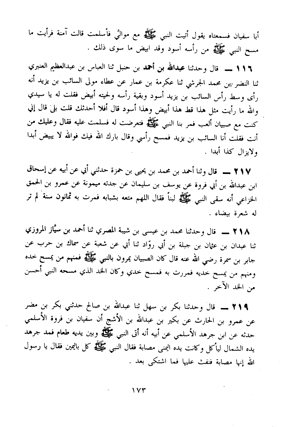 216 - قَالَ وَحدثنَا عبد الله بْنُ أَحْمَدَ بْنِ حَنْبَلٍ ثَنَا الْعَبَّاس بن عبد العظيم الْعَنْبَرِيُّ ثَنَا النَّضْرُ بْنُ مُحَمَّدٍ الْجَرْشِيُّ ثَنَا عِكْرِمَةُ بْنُ عَمَّارٍ عَنْ عَطَاءٍ مَوْلَى السَّائِبِ بْنِ يَزِيدَ أَنَّهُ رَأَى وَسَطَ رَأْسِ السَّائِبِ بْنِ يَزِيدَ أَسْوَدَ وَبَقِيَّةَ رَأْسِهِ وَلِحْيَتَهُ أَبْيَضُ فَقُلْتُ لَهُ يَا سَيْدِي وَاللَّهِ مَا رَأَيْتُ مِثْلَ هَذَا قَطُّ هَذَا أَبْيَضُ وَهَذَا أَسْوَدُ قَالَ أَفَلَا أُحَدِّثُكَ قُلْتُ بَلَى قَالَ إِنِّي كُنْتُ مَعَ صِبْيَانِ أَلْعَبُ فَمَرَّ بِنَا النَّبِيِّ صَلَّى اللَّهُ عَلَيْهِ وَسَلَّمَ فَتَعَرَّضْتُ لَهُ فَسَلَّمْتُ عَلَيْهِ فَقَالَ وَعَلَيْكَ مَنْ أَنْتَ فَقُلْتُ أَنَا السَّائِبُ بْنُ يَزِيدَ فَمَسَحَ رَأْسِي وَقَالَ بَارَكَ اللَّهُ فِيكَ فَوَاللَّهِ لَا يَبْيَضُّ أَبَدًا وَلَا يَزَالُ كَذَا أَبَدًا