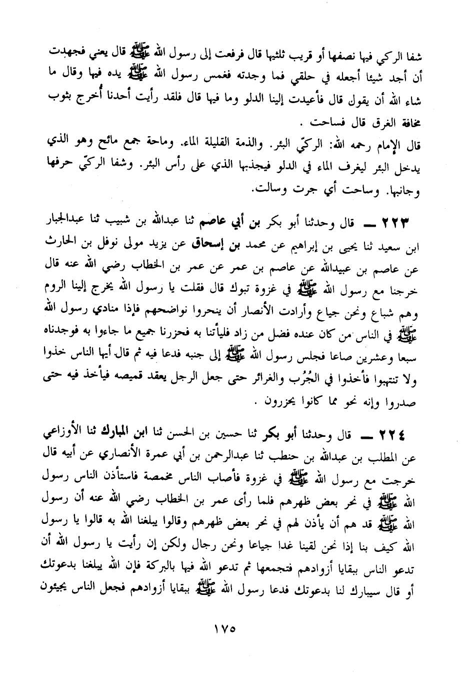 224 - قَالَ وَحَدَّثَنَا أَبُو بَكْرٍ ثَنَا حُسَيْنُ بْنُ الْحَسَنِ ثَنَا ابْنُ الْمُبَارَكِ ثَنَا الْأَوْزَاعِيُّ عَنِ الْمَطَّلِبِ بْنِ عَبْدِ اللَّهِ بْنِ حَنْطَبٍ ثَنَا عَبْدُ الرَّحْمَنِ بْنُ أَبِي عَمْرَةَ الْأَنْصَارِيُّ عَنْ أَبِيهِ قَالَ خَرَجْتُ مَعَ رَسُولَ اللَّهِ صَلَّى اللَّهُ عَلَيْهِ وَسَلَّمَ فِي غَزْوَةٍ فَأَصَابَ النَّاسَ مَخْمَصَةٌ فَاسْتَأْذَنَ النَّاسُ رَسُولَ اللَّهِ صَلَّى اللَّهُ عَلَيْهِ وَسَلَّمَ فِي نَحْرِ بَعْضِ ظَهْرِهِمْ فَلَمَّا رَأَى عُمَرُ بْنُ الْخَطَّابِ رَضِيَ اللَّهُ عَنْهُ أَنّ رَسُولَ اللَّهِ صَلَّى اللَّهُ عَلَيْهِ وَسَلَّمَ قَدْ هَمَّ أَنْ يَأْذَنَ لَهُمْ فِي نَحْرِ بَعْضِ ظَهْرِهِمْ وَقَالُوا يُبَلِّغُنَا اللَّهُ بِهِ يَا رَسُولَ اللَّهِ كَيْفَ بِنَا إِذَا نَحْنُ لَقِينَا غَدًا جِيَاعًا وَنَحْنُ رِجَالٌ وَلَكِنْ إِنْ رَأَيْتَ يَا رَسُول الله أَن تدعوا النَّاسَ بِبَقَايَا أَزْوَادِهِمْ فَتَجْمَعُهَا ثُمَّ تدعوا اللَّهَ فِيهَا بِالْبَرَكَةِ فَإِنَّ اللَّهَ يُبَلِّغُنَا بِدَعْوَتِكَ أَوْ قَالَ سَيُبَارِكُ لَنَا بِدَعْوَتِكَ فَدَعَا رَسُولُ اللَّهِ صَلَّى اللَّهُ عَلَيْهِ وَسَلَّمَ بِبَقَايَا أَزْوَادِهِمْ فَجَعِلَ النَّاسُ يَجِيئُونَ