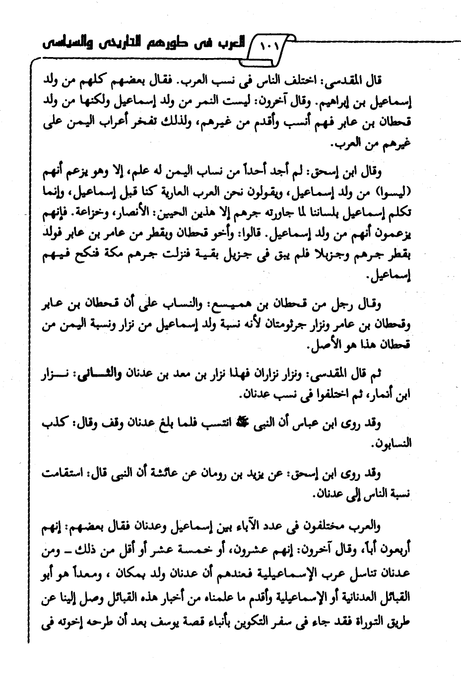 والعرب مختلفون في عدد الآباء بين إسماعيل وعدنان فقال بعضهم: إنهم أربعون أبا، وقال آخرون: إنهم عشرون، أو خمسة عشر أو أقل من ذلك -ومن عدنان تناسل عرب الإسماعيلية فعندهم أن عدنان ولد بمكان، ومعدا هو أبو القبائل العدنانية أو الإسماعيلية، وأقدم ما علمناه من أخبار هذه القبائل وصل إلينا عن طريق التوراة؛ فقد جاء في سفر التكوين بأنباء قصة يوسف بعد أن طرحه إخوته في