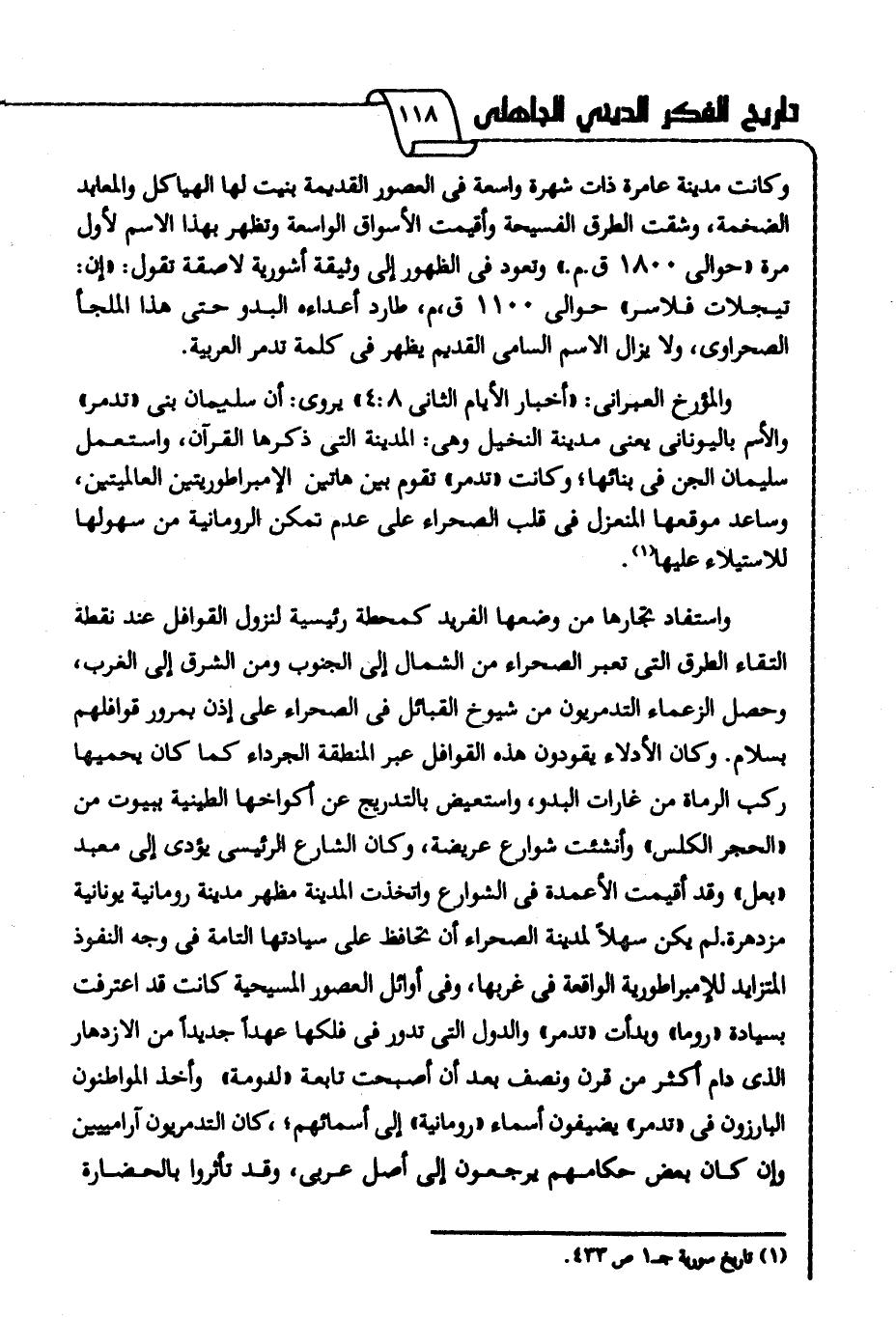 والمؤرخ العبراني: "أخبار الأيام الثاني 8: 4" يروى: أن سليمان بني "تدمر"، والاسم باليوناني يعني مدينة النخيل؛ وهي: المدينة التي ذكرها القرآن، واستعمل سليمان الجن في بنائها؛ وكانت "تدمر" تقوم بين هاتين الإمبراطوريتين العالميتين، وساعد موقعها المنعزل في قلب الصحراء على عدم تمكن الرومانية من سهولها؛ للاستيلاء عليها1.