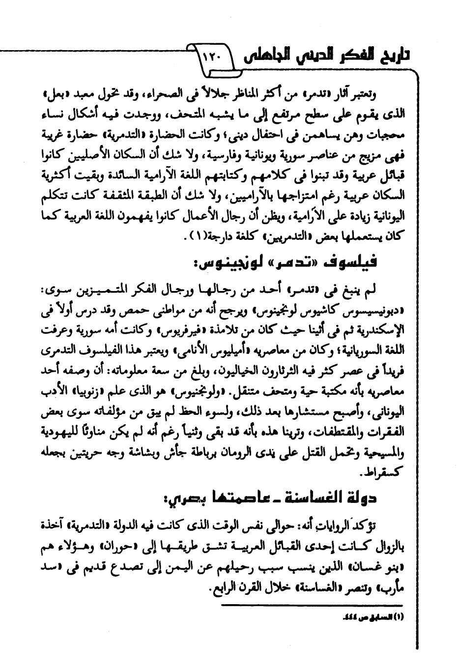 وتعتبر آثار "تدمر" من أكثر المناظر جلالا في الصحراء، وقد تحول معبد "بعل" الذي يقوم على سطح مرتفع إلى ما يشبه المتحف، ووجدت فيه أشكال نساء محجبات وهن يساهمن في احتفال ديني؛ وكانت الحضارة "التدمرية" حضارة غريبة فهي مزيج من عناصر سورية ويونانية وفارسية، ولا شك أن السكان الأصليين كانوا قبائل عربية وقد تبنوا في كلامهم وكتابتهم اللغة الآرامية السائدة، وبقيت أكثرية السكان عربية رغم امتزاجها بالآراميين، ولا شك أن الطبقة المثقفة كانت تتكلم اليونانية زيادة على الآرامية، ويظن أن رجال الأعمال كانوا يفهمون اللغة العربية كما كان يستعملها بعض "التدمريين" كلغة دارجة1.