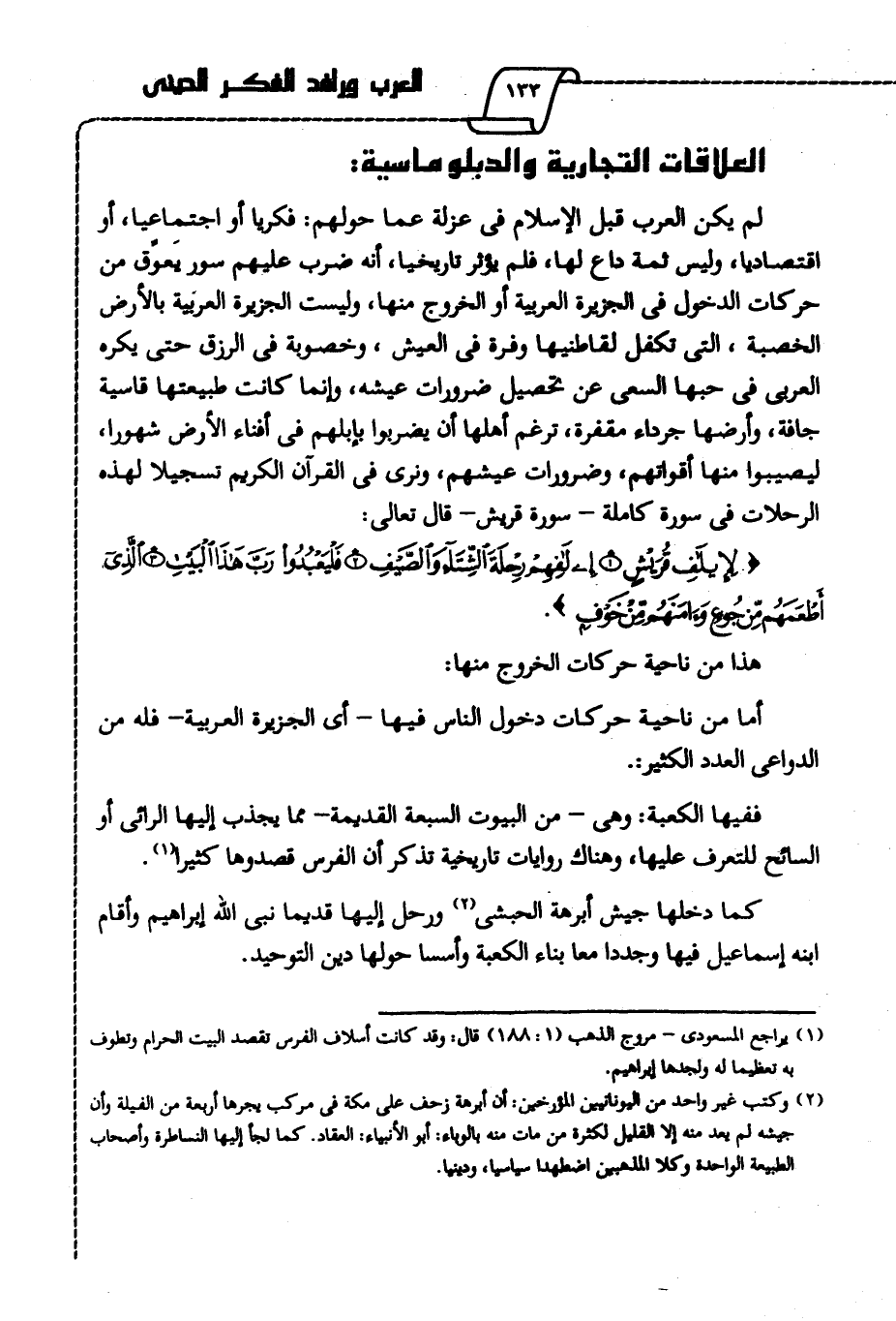لم يكن العرب قبل الإسلام في عزلة عما حولهم: فكريًّا او اجتماعيًّا، أو اقتصاديًّا، وليس ثمة داعٍ لها، فلم يؤثر تاريخي، أنه ضرب عليهم سور يعوق من حركات الدخول في الجزيرة العربية أو الخروج منها، وليست الجزيرة العربية بالأرض الخصبة، التي تكفل لقاطنيها وفرة في العيش، وخصوبة في الرزق حتى يكره العربي في حبها السعي عن تحصيل ضرورات عيشه، وإنما كانت طبيعتها قاسية جافة، وأرضها جرداء مقفرة، ترغم أهلها أن يضربوا بإبلهم في أفناء الأرض شهورًا؛ ليصيبوا منها أقواتهم، وضرورات عيشهم، ونرى في القرآن الكريم تسجيلًا لهذه الرحلات في سورة كاملة -سورة قريش- قال تعالى: