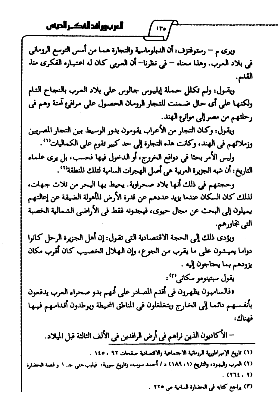 ويرى م -رستوفتزف: أن الدبلوماسية والتجارة هما من أسس التوسع الروماني في بلاد العرب. وهذا معناه -في نظرنا- أن العربي كان له اعتباره الفكري منذ القدم.