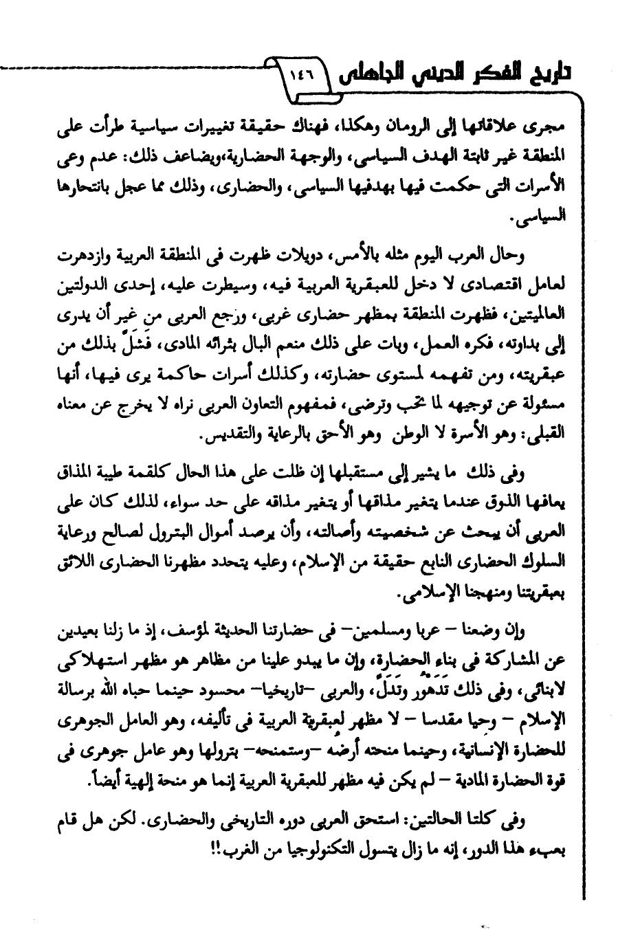 وفي كلتا الحالتين: استحق العربي دوره التاريخي والحضاري لكن هل قام بعبء هذا الدور، إنه ما زال يتسول التكنولوجيا من الغرب!!